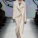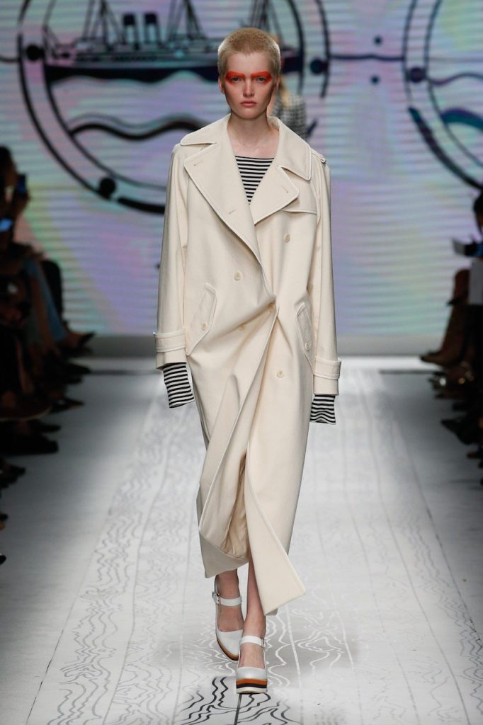While Max Mara Spring/Summer 2016 is a basic collection, it clearly diverges from the typical brand’s production. Maybe is the – regularly repeated – stars and stripes motif on pants and cabanas which, although in tone with this brand for the ultra classic style, seems far away from been conventional, and surely nothing we saw before. Extra long sleeves, irregular plackets, unexpected see-through, unusual color combinations and last – but not least – a fluorescent make-up, seems all contribute to the innovative vibe of this collection.