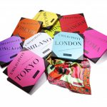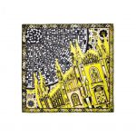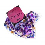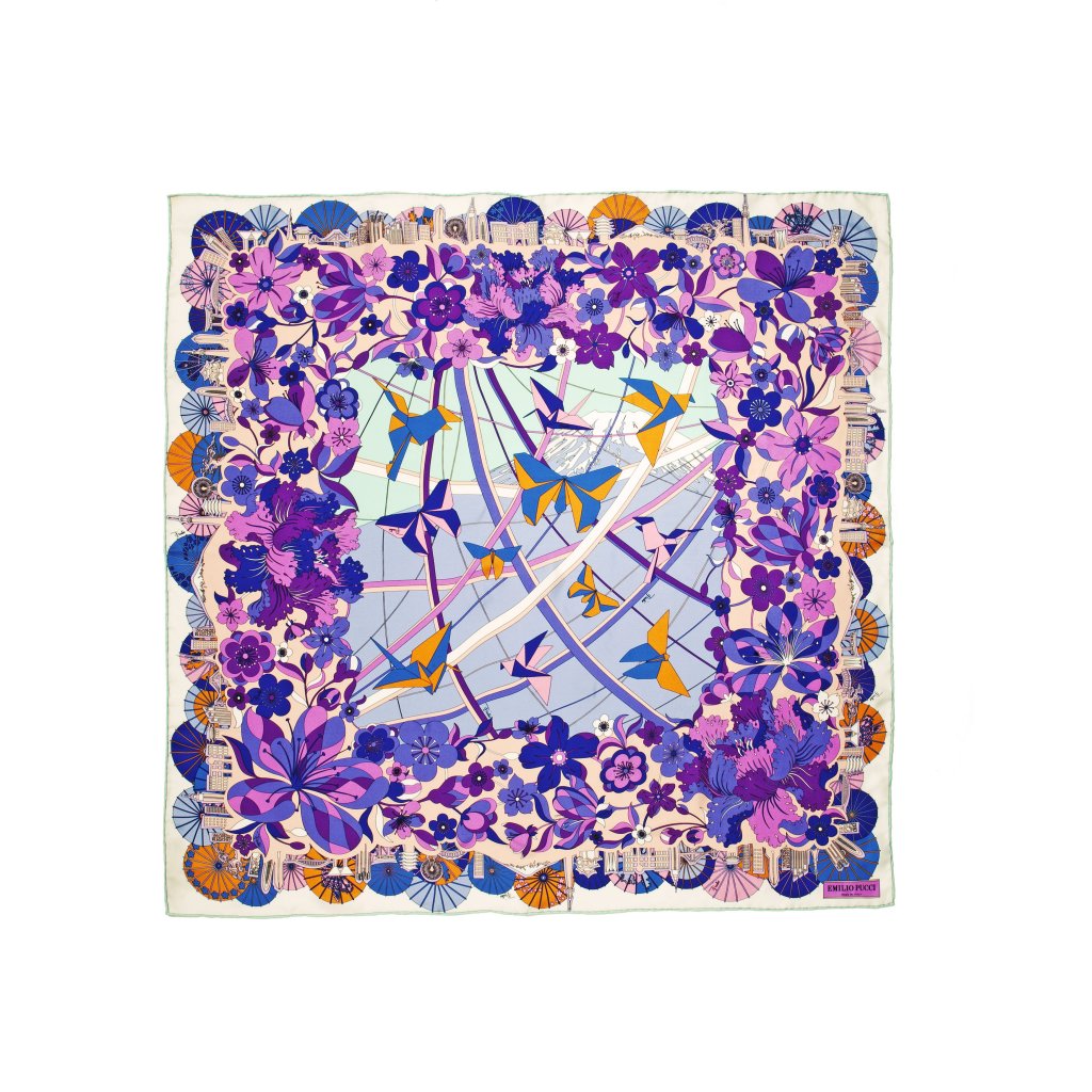 The scarf dedicated to London conveys the vibrant atmosphere of the English city, ironically represented by a patchwork of symbolic images like the taxi, telephone box, pub; in the background the quintessential symbols of the capital like the London Eye and Gherkin. The edges are richly decorated with designs inspired to the Crown jewels. The main color is orange with light blue, musk-green and grass-green accents. The scarf dedicated to Tokyo is rich of graphic motifs to identify the city and Japan, combining the splendid natural elements and the high technology, characteristics of the country’s culture. The Mount Fuji appears on the background, seen through an origami of flying butterflies and birds as in a traditional Japanese garden, between a maze of ribbons reminding the electric wires of Tokyo. The frame of the composition is adorned by an explosion of flowers, the city’s skyline and the iconic small umbrellas. The color palette blends from purple to pink with touches of blue lapis lazuli and tangerine orange.