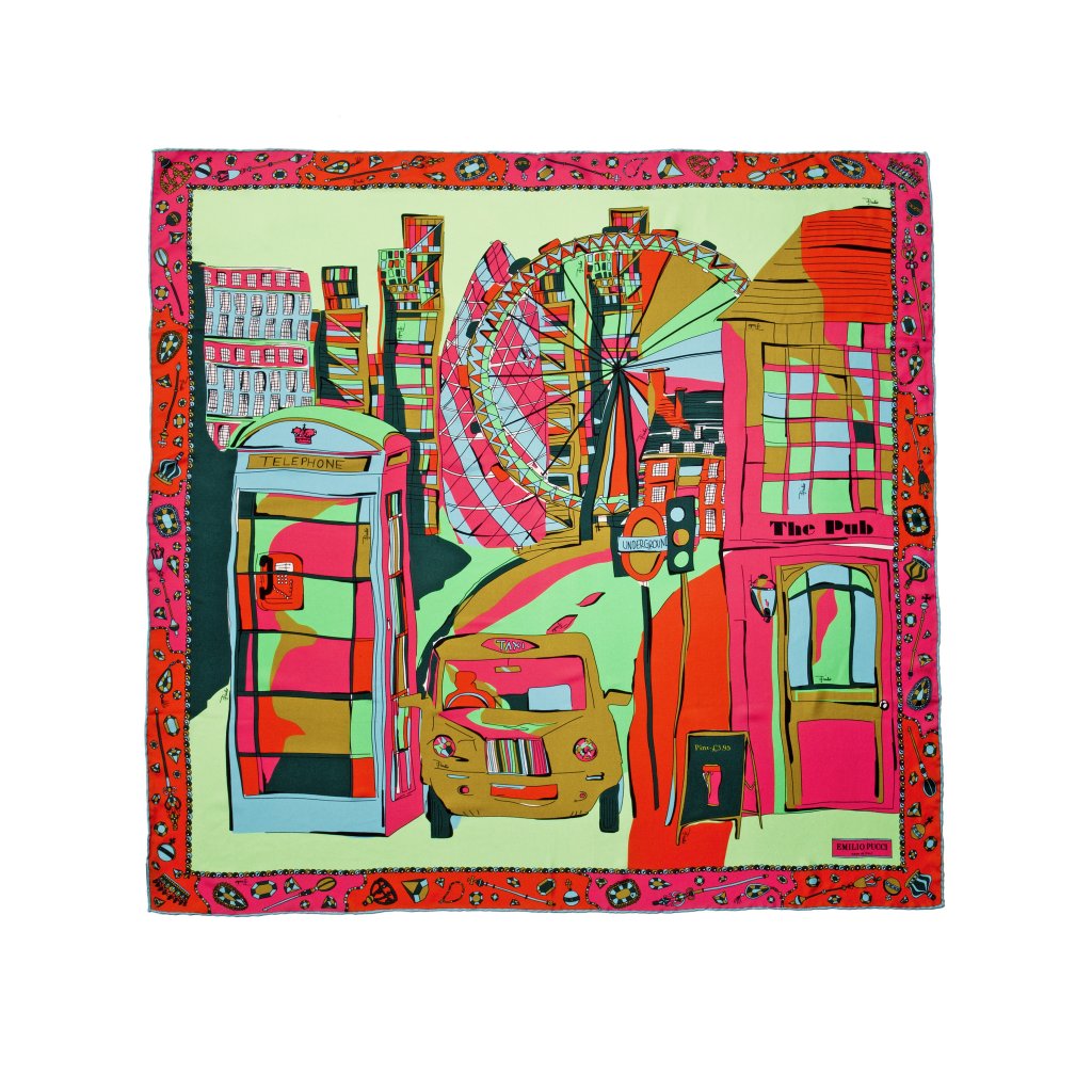Since their launch last year, Emilio Pucci’s Cities of the World scarves have instantly allured fans with their vibrant, eye-catching designs and timeless appeal. Now the project gains momentum with its expansion to three new corners of the globe: Milan, London and Tokyo. Realized as modern day postcards and special celebration to the cities of the world, each silk scarf features exclusive Pucci prints and are one-of-a-kind fashion accessories to wear and collect. After the launch of Florence, Rome, New York, Paris, Shanghai and Hong Kong in 2014, each of the new cities represents an important key-city forEmilio Pucci’s world. The scarf dedicated to Milan – the city where the fashion house has recently opened a new boutique – celebrates its peculiarities. The stylized representation of the city depicts two of the most famous architectural highlights: the Duomo façade dating back to the 16th century and the magnificent glass cupola of Galleria Vittorio Emanuele II, dating back to the 19th century. The central design is framed with a floral motif and background reminding the Duomo’s inlaid marble floor ornaments. The scarf is available in white and black with acid green and olive green nuances, giving a lively and sophisticated touch.