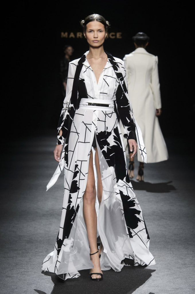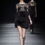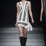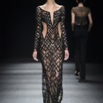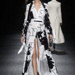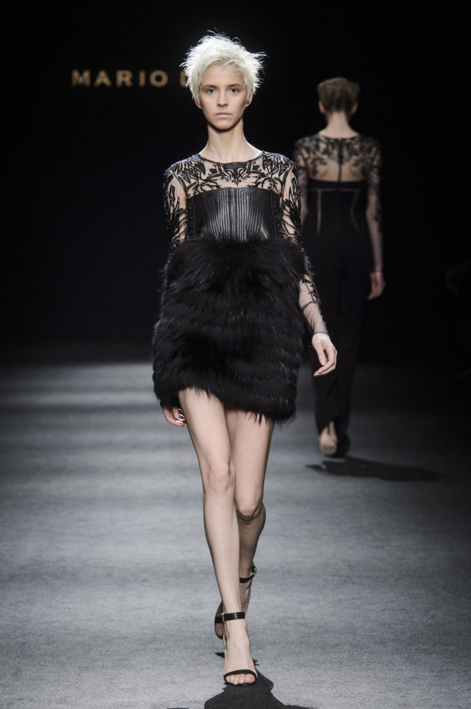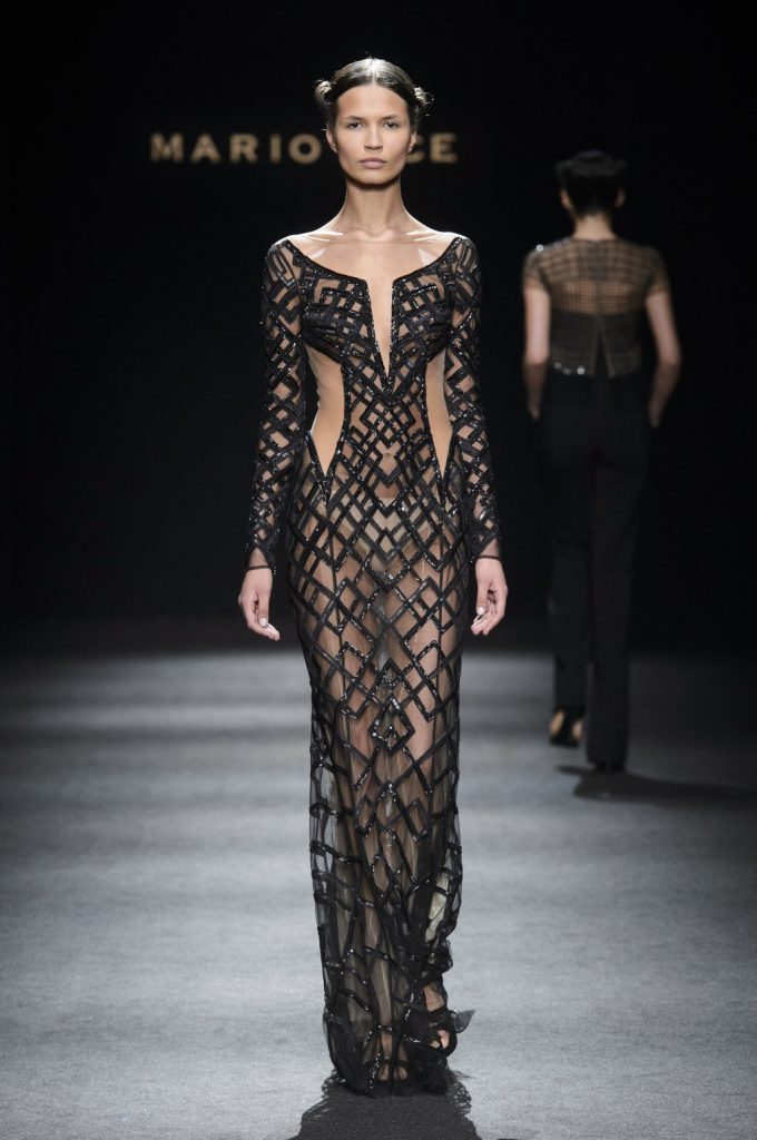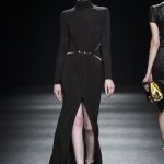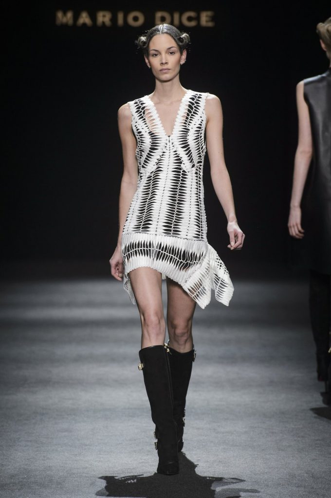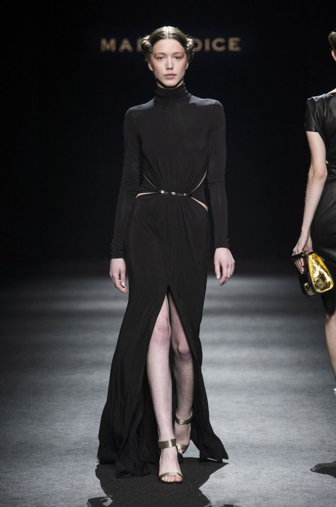 “Lines originally parallel intertwine each other, mixing up to create a tangle that give life to something amazing, an inspiration to New York in the 80s, a gift to the best ever master CLAUDE MONTANA”. This is the mood of Mario Dice Fall/Winter 2015-16 collection, a determined woman, with a strong personality, who dares without exaggerate emphasizing her own femininity. Opposites are protagonists, from exasperate lengths to the shortest ones, from plunging necklines up to turtleneck jersey dresses. Imperceptible seams for sheath dresses that look like a second skin, narrow hip in order to highlight the silhouette in both night and day versions in jersey. High waist hip pants with a tuxedo cut, nappa leather longuette, double-breasted pinstripe suits with important shoulder pads, and ankle-length cashmere gown coats in pure cashmere liven up the elegant and strong character of the young designer’s debut fashion show. Precious embellishments such as the flocked, but also geometrical and optical 3D effects complete a collection of lines that has the power of making us dream, the prime basis of any kind of construction, project and ideal.