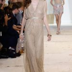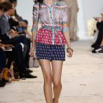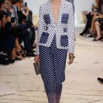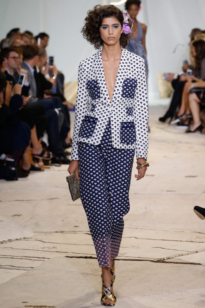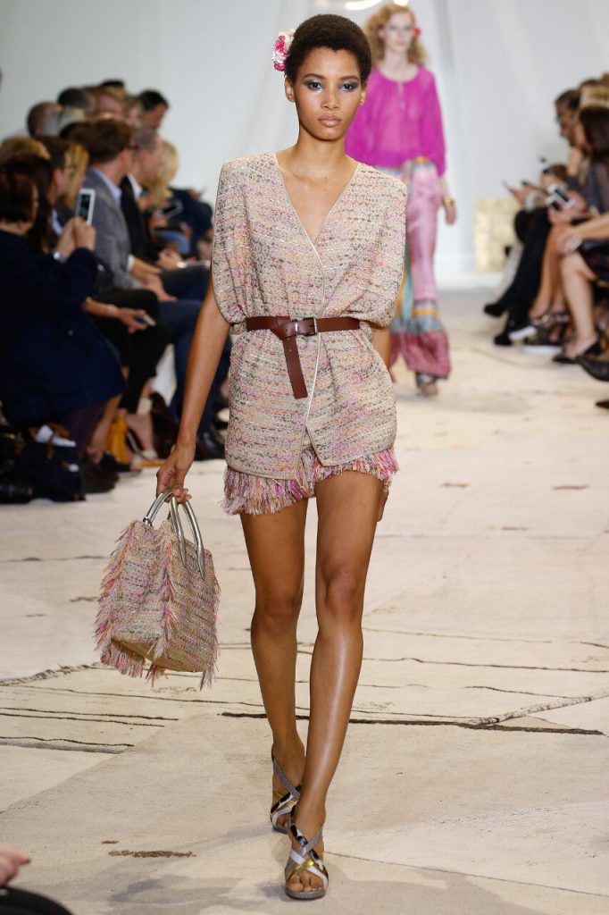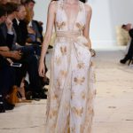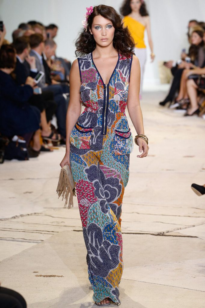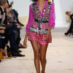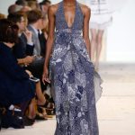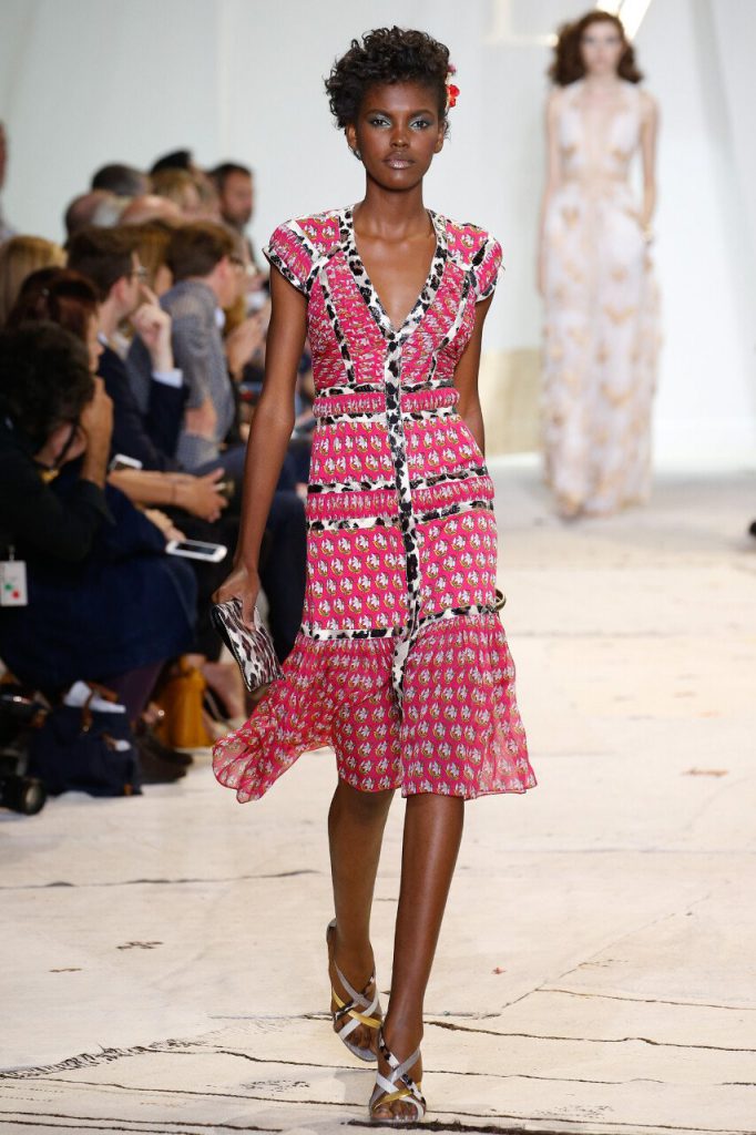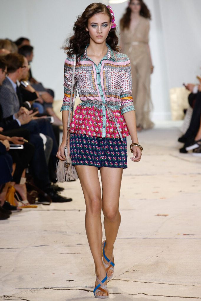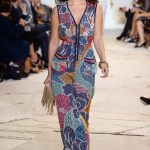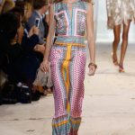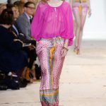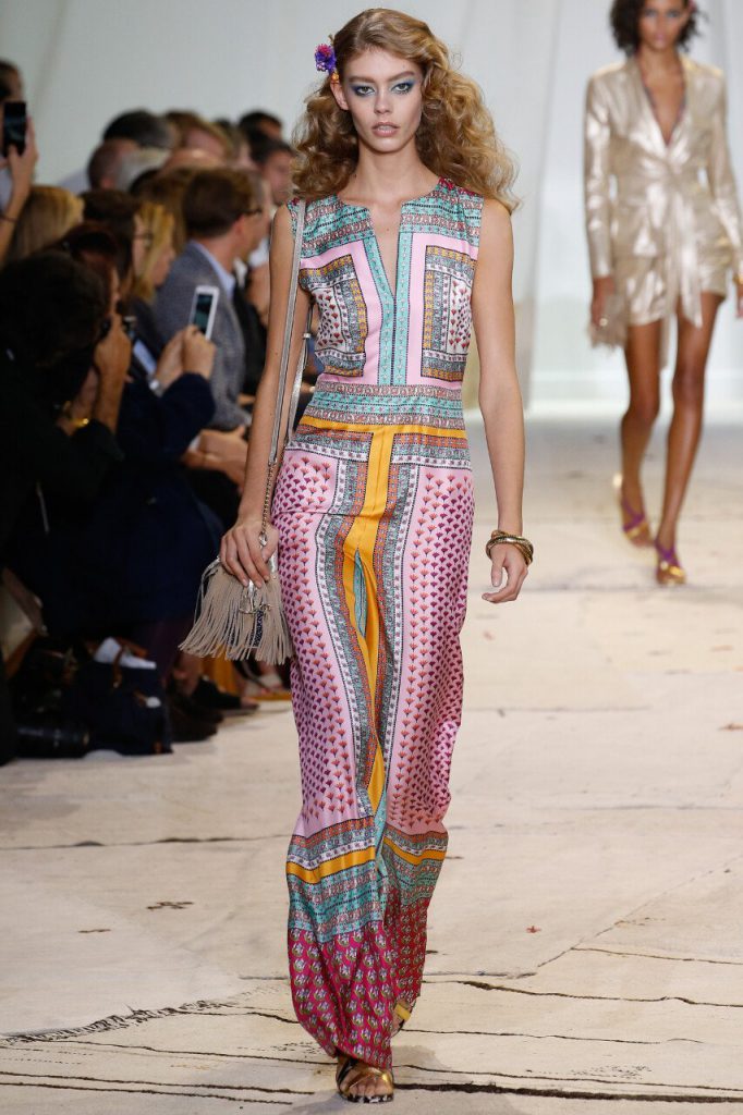 In a pink silk jersey twist, with golden-heeled shoes and flowers in the hair, DVF Spring/Summer 2016 woman is a source of inspiration, wearing with nonchalance either a printed palazzo jumpsuit and a suit vest with metal flecks. Her body swathed in chiffon, wearing a clutch with fringes, and playing with bright colors and mixed patterns. An unforgettable image, in a vivid pink dress combined with spotted sandals and a crown cap made of hydrangeas.
