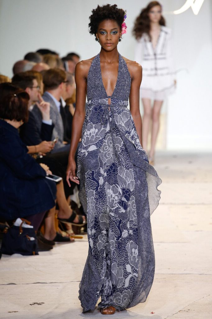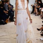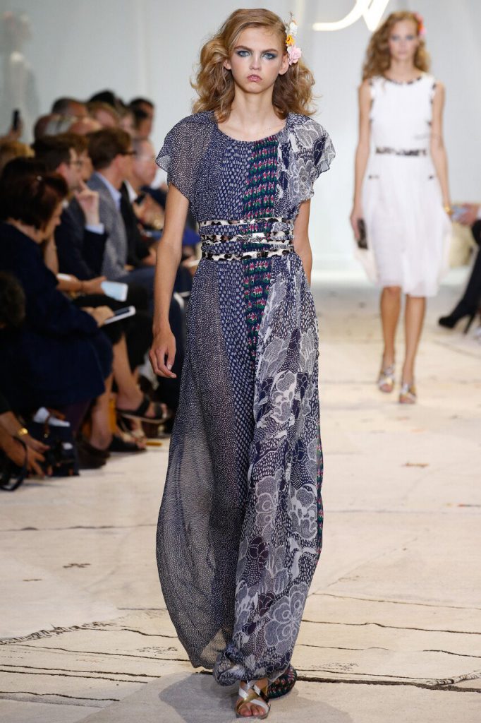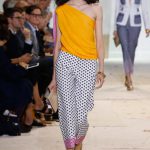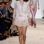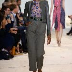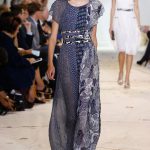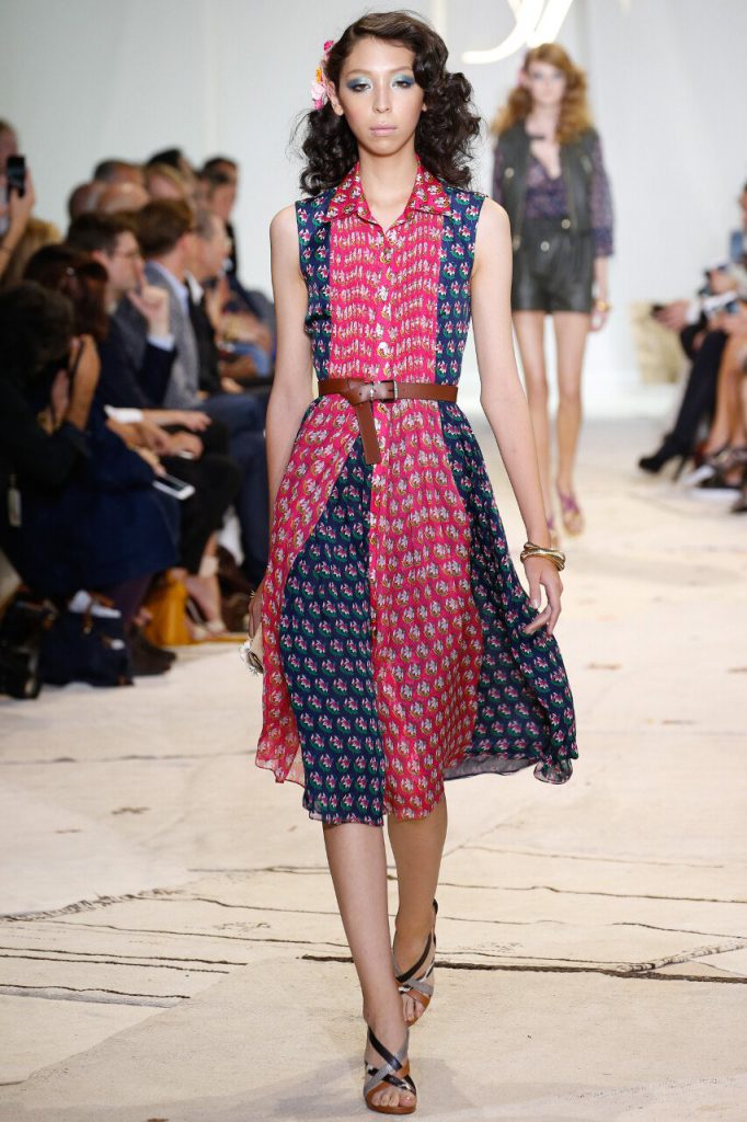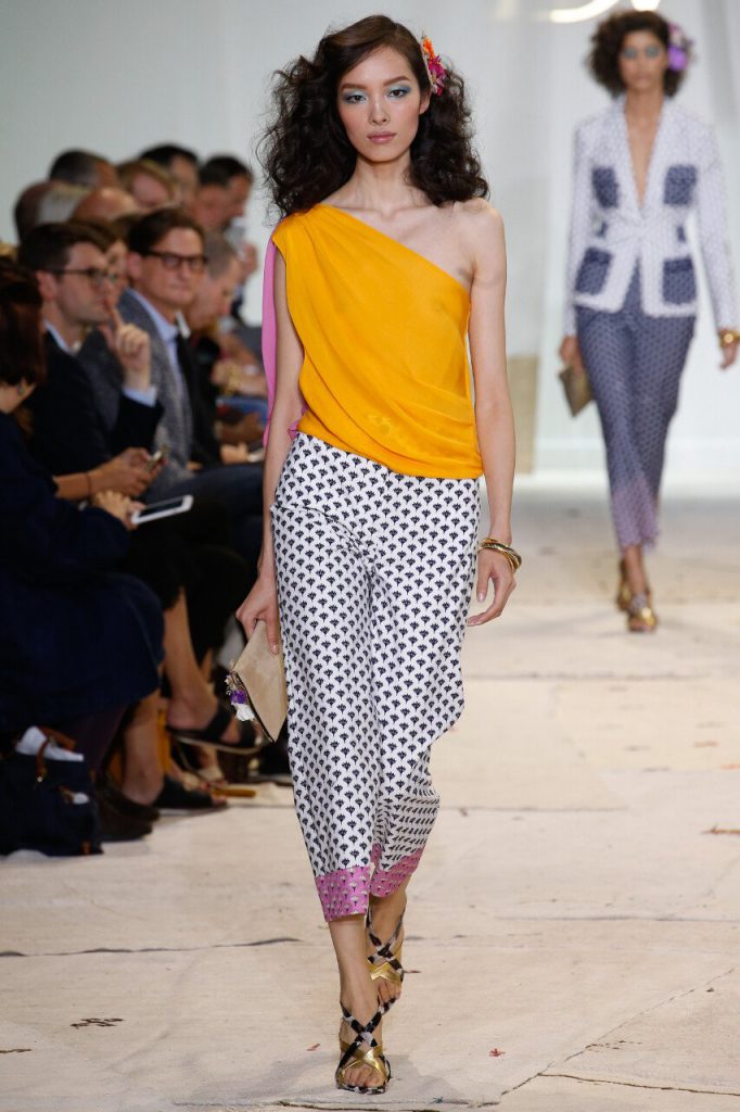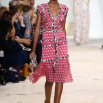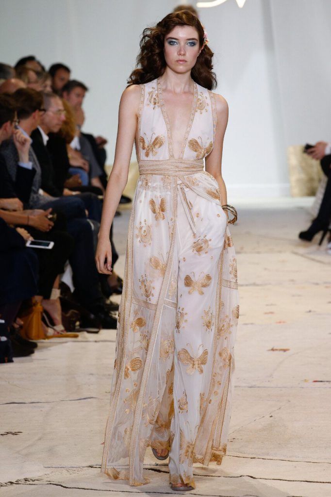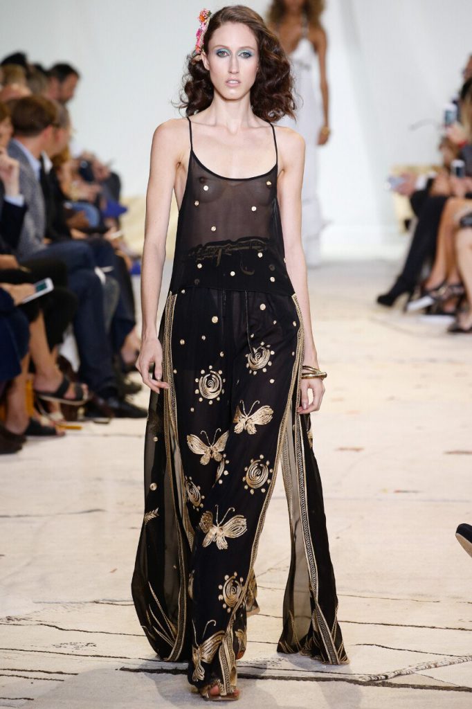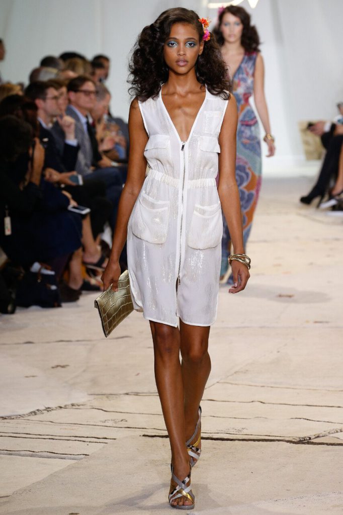 In a pink silk jersey twist, with golden-heeled shoes and flowers in the hair, DVF Spring/Summer 2016 woman is a source of inspiration, wearing with nonchalance either a printed palazzo jumpsuit and a suit vest with metal flecks. Her body swathed in chiffon, wearing a clutch with fringes, and playing with bright colors and mixed patterns. An unforgettable image, in a vivid pink dress combined with spotted sandals and a crown cap made of hydrangeas.
