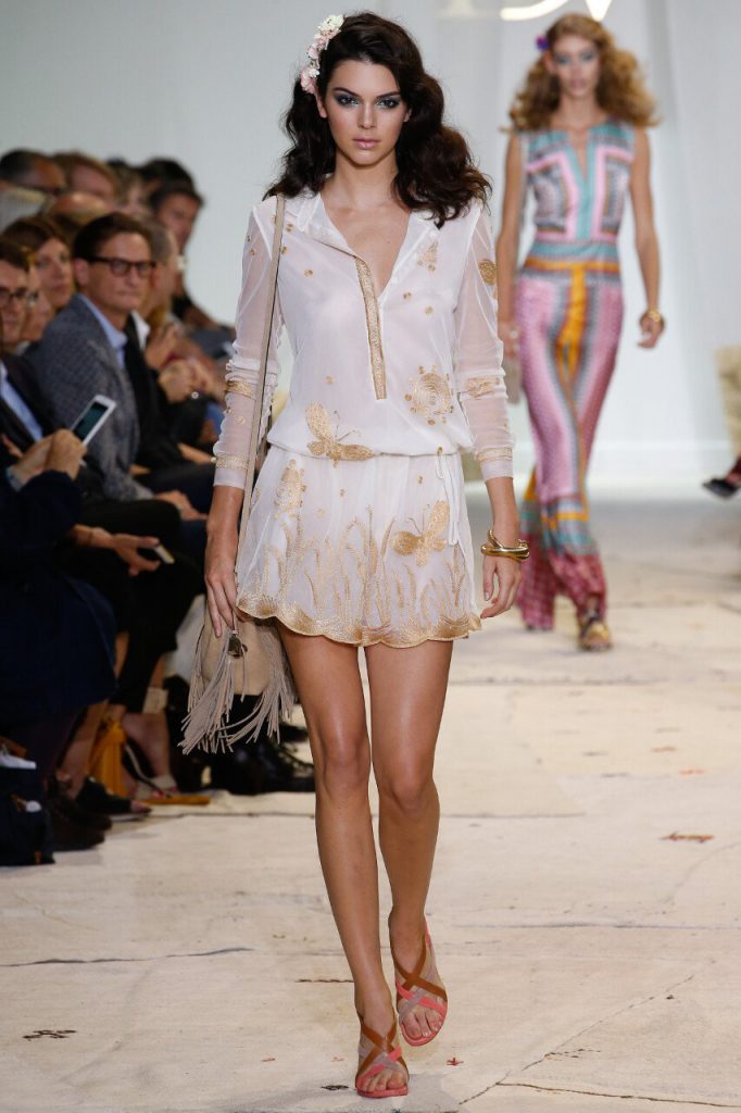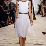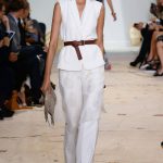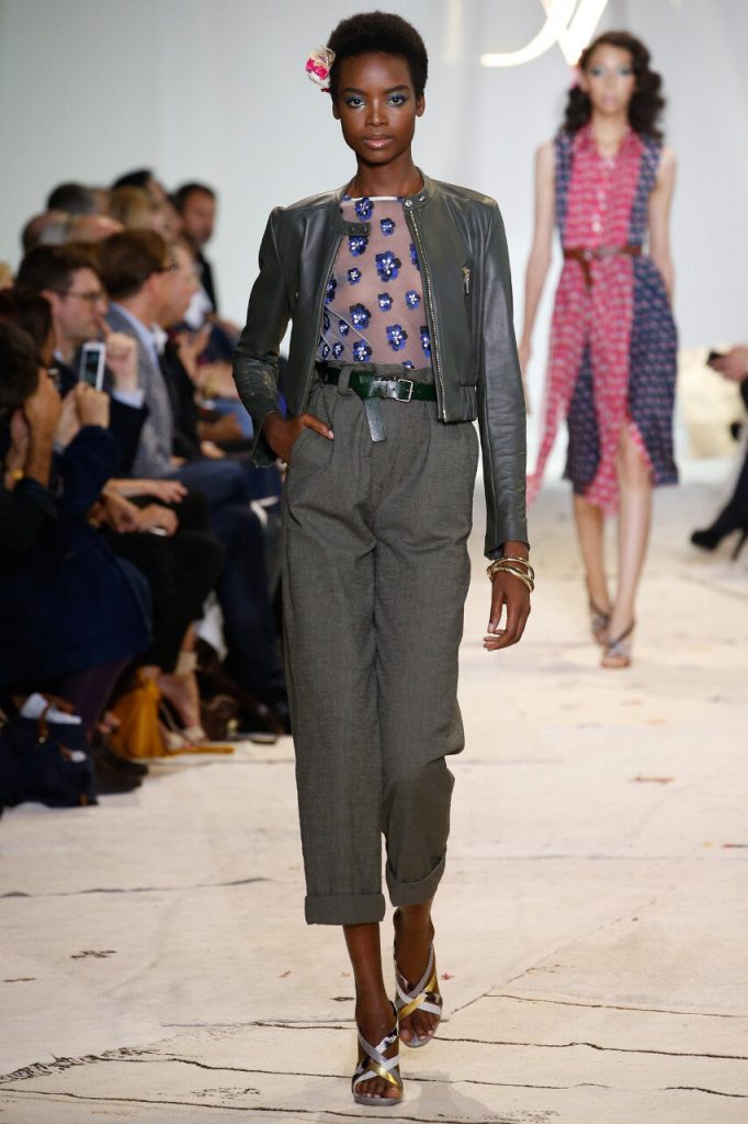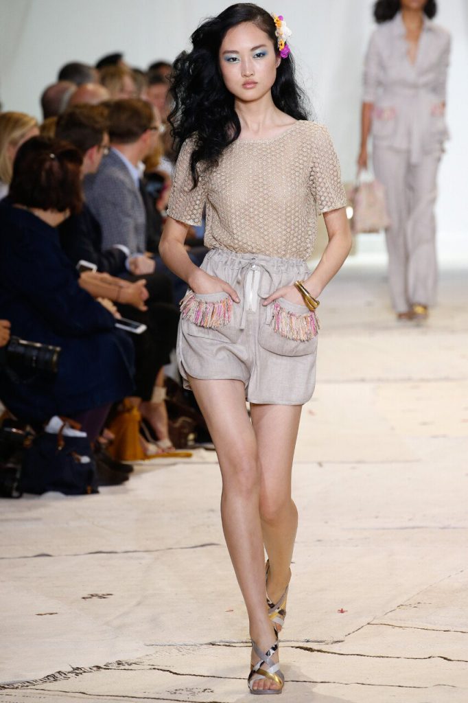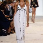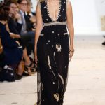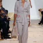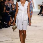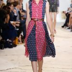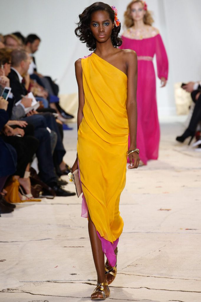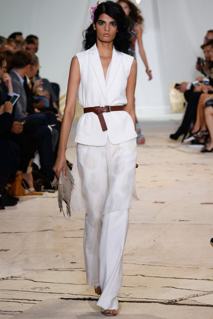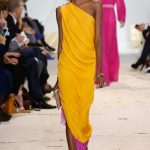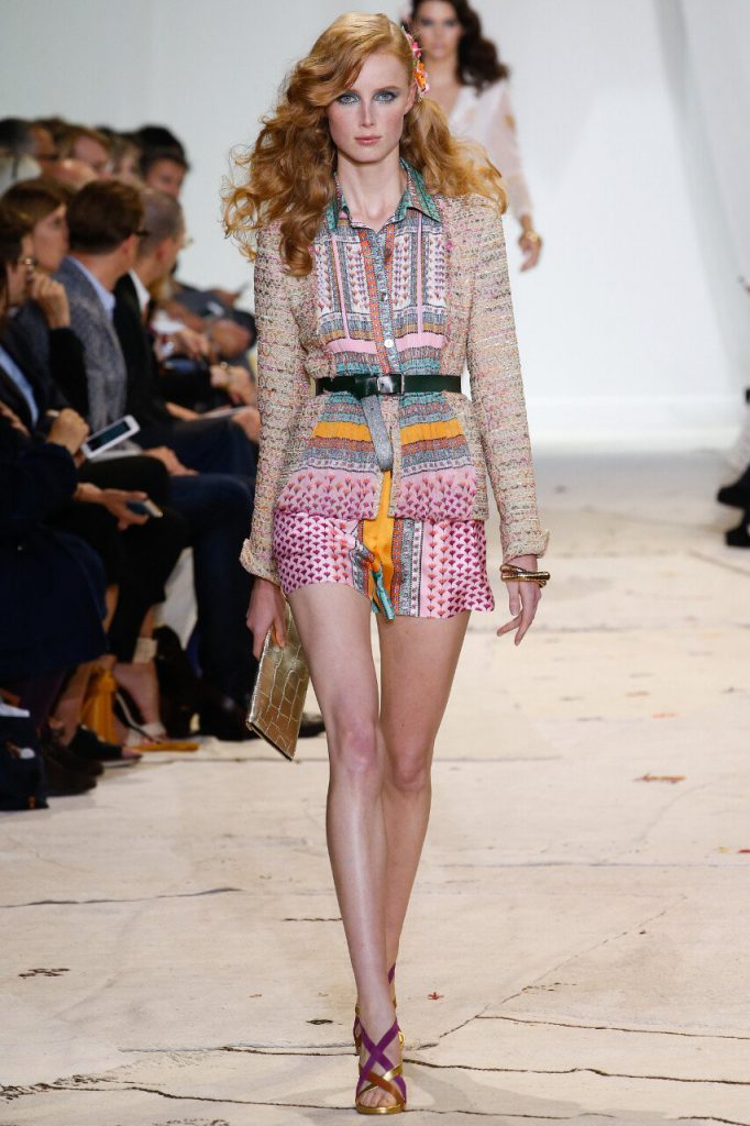 In a pink silk jersey twist, with golden-heeled shoes and flowers in the hair, DVF Spring/Summer 2016 woman is a source of inspiration, wearing with nonchalance either a printed palazzo jumpsuit and a suit vest with metal flecks. Her body swathed in chiffon, wearing a clutch with fringes, and playing with bright colors and mixed patterns. An unforgettable image, in a vivid pink dress combined with spotted sandals and a crown cap made of hydrangeas.