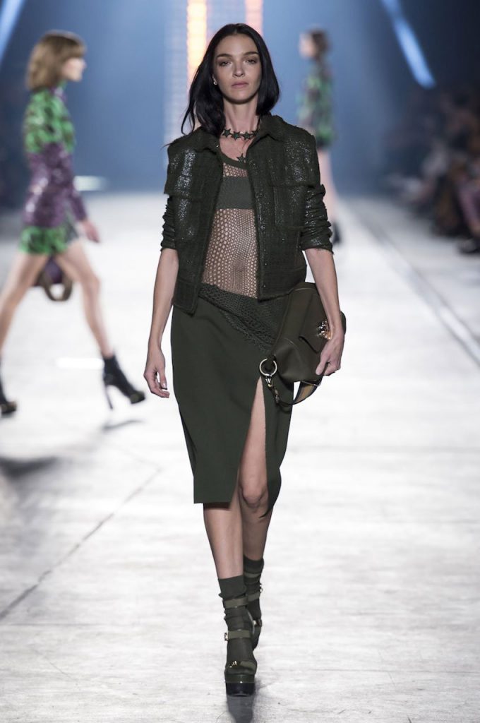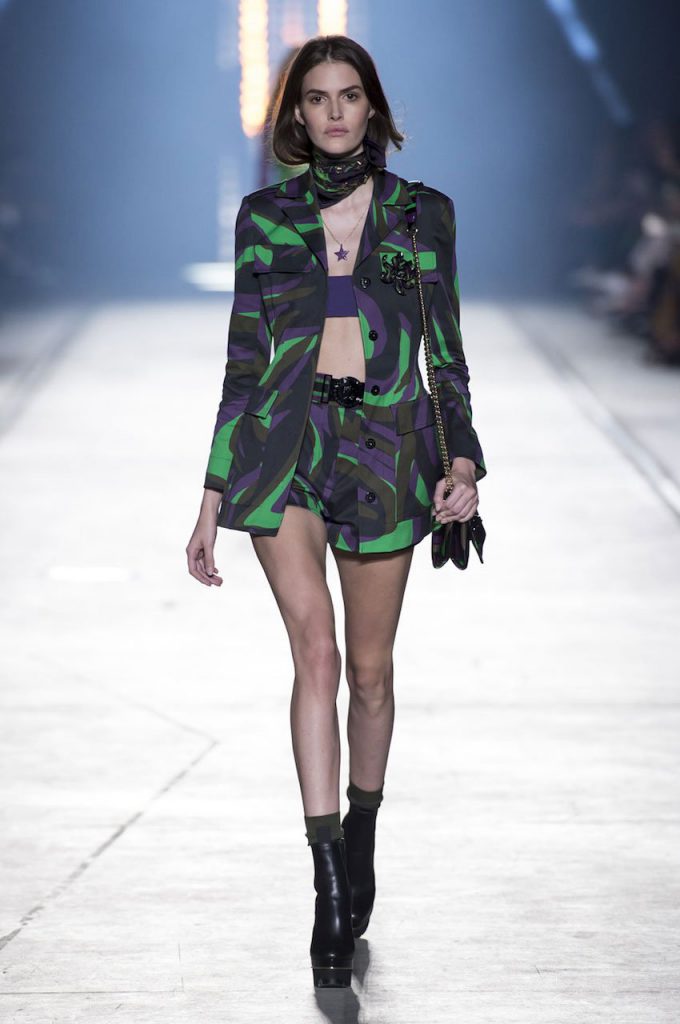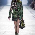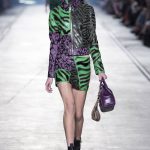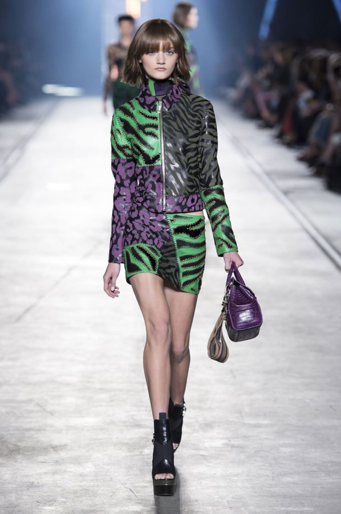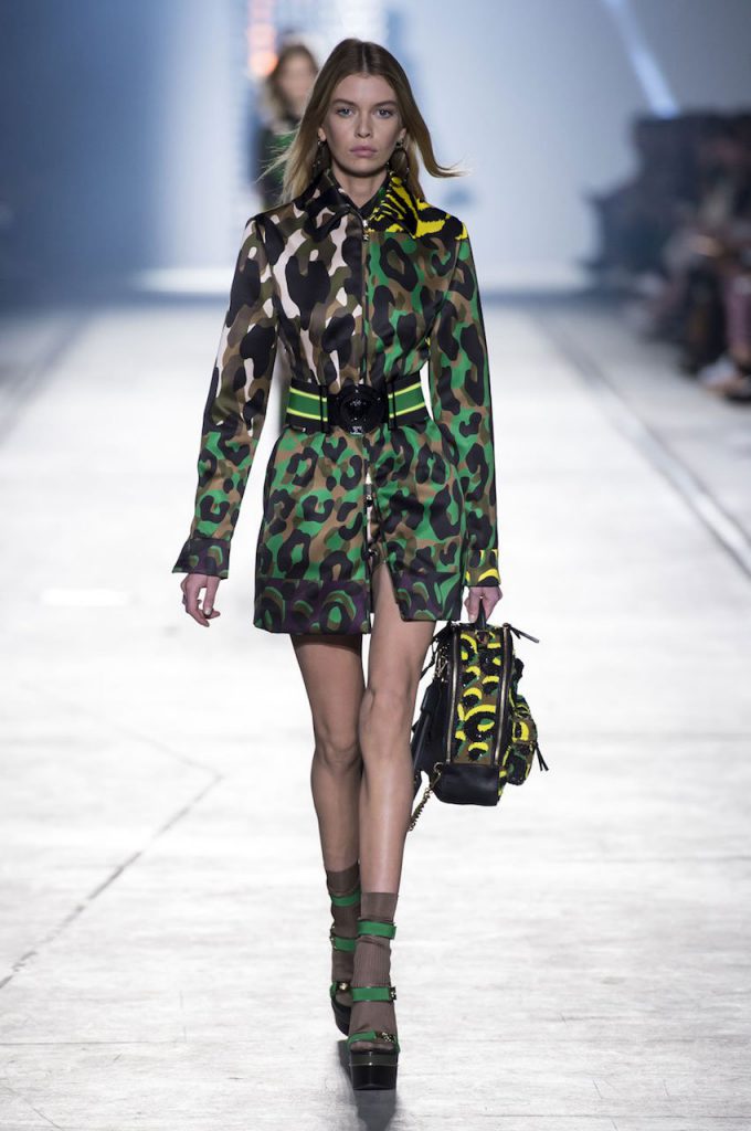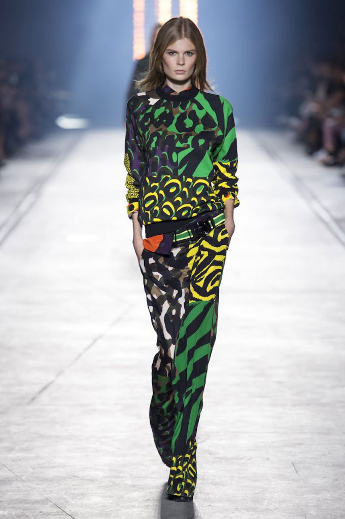 “This is a collection for the way women live their lives today, mixing tailoring with sportswear and effortless glamour,” summed up Donatella Versace talking about her Spring/Summer 2016 collection mood. It has everything in it: sculpted silhouettes, flounces, military jackets turned into business dresses and chiffon fringed blazers on top of pencil skirts. It is sharp, it is bright, it is slits to the thigh on slinky little evening dresses. Jungle and camouflage combinations in neon orange, jungle green, purple and black are mixed with street outfits, leopard and zebra prints are layered together. Waist definition via a neon belt is key, tough jackets patched with animal print as is theVersace military jacket – be it a bomber, be it a blazer, a blouson, cropped or not.