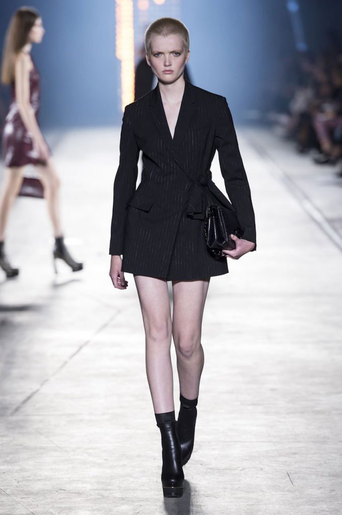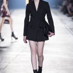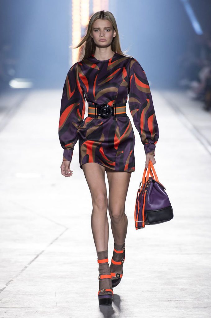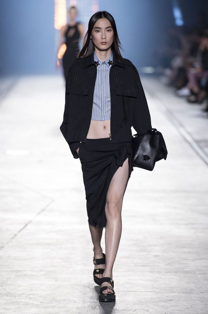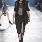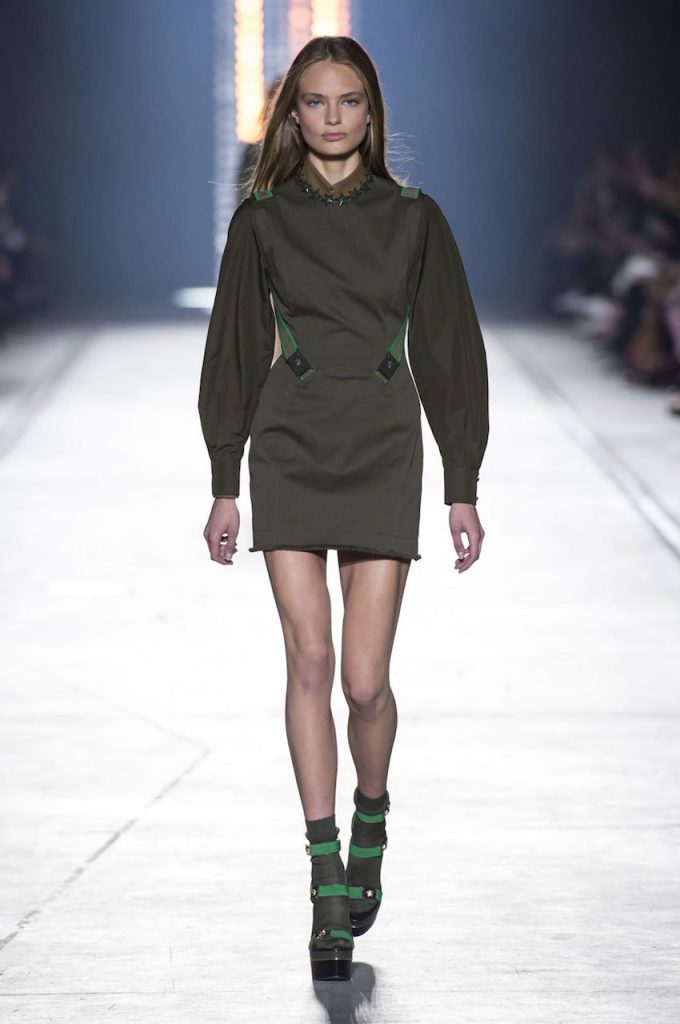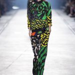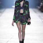“This is a collection for the way women live their lives today, mixing tailoring with sportswear and effortless glamour,” summed up Donatella Versace talking about her Spring/Summer 2016 collection mood. It has everything in it: sculpted silhouettes, flounces, military jackets turned into business dresses and chiffon fringed blazers on top of pencil skirts. It is sharp, it is bright, it is slits to the thigh on slinky little evening dresses. Jungle and camouflage combinations in neon orange, jungle green, purple and black are mixed with street outfits, leopard and zebra prints are layered together. Waist definition via a neon belt is key, tough jackets patched with animal print as is theVersace military jacket – be it a bomber, be it a blazer, a blouson, cropped or not.