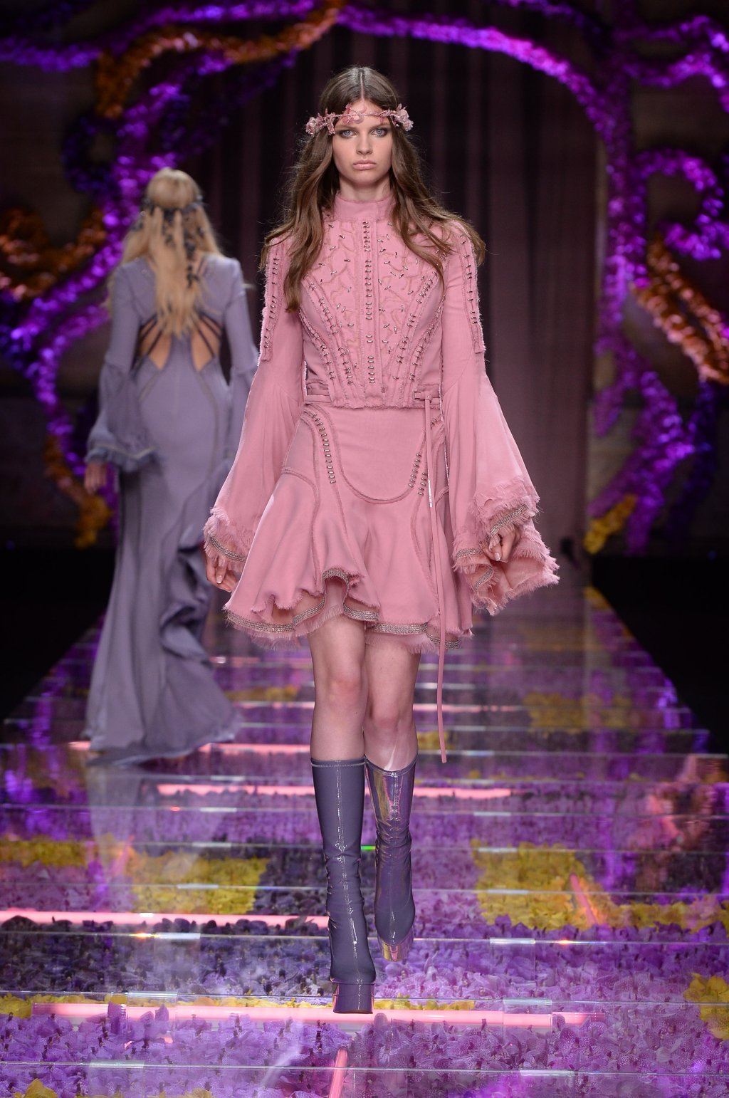A burst of volume comes from crystal bodice gowns with skirts of shredded and raw-edged chiffon and tulle on a sheer base.High platform heels are worn with each look, boots or sandals providing a toughened contrast to the softness all around.