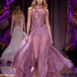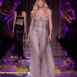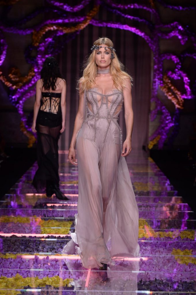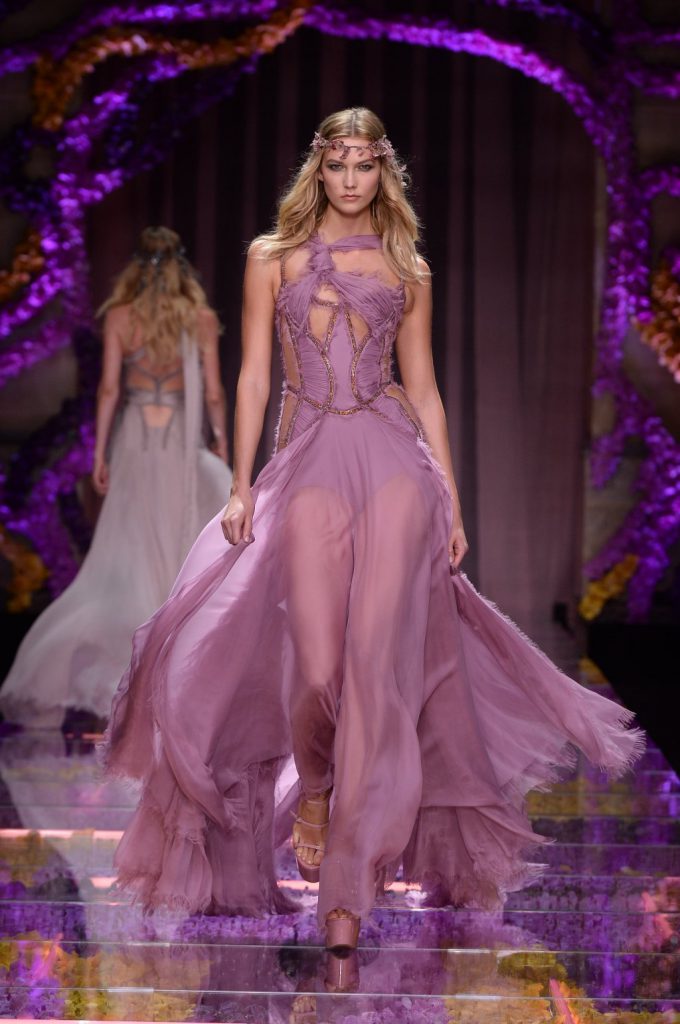 Tough ethereal. Impeccable imperfection. A new Versace evolution. Elevated deconstruction, softness. Stripped of detail, transparent silk chiffon gowns flow from boned body lined in velvet, the fabric free to float as if pure air. Lightweight chiffon layers bring softness to tailoring, especially with the drape of bell sleeves. The tailoring is punctuated by metal staples that define the silhouette. Cut-out chiffon layers create raw-edged flowers that decorate chiffon dresses in dove grey, powdery pink, faded green and lilac. Fil coupé velvet and hand-painted flowers are floating on a long gown as if destroyed, with boning lined in velvet at a sheer body. A string of flowers trails up to hold the dress at the neck and the head.