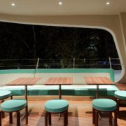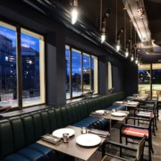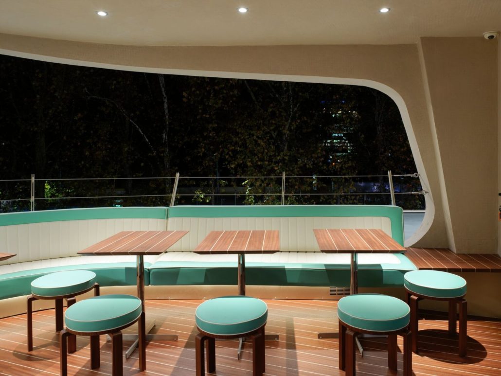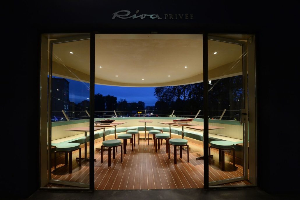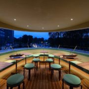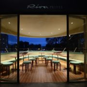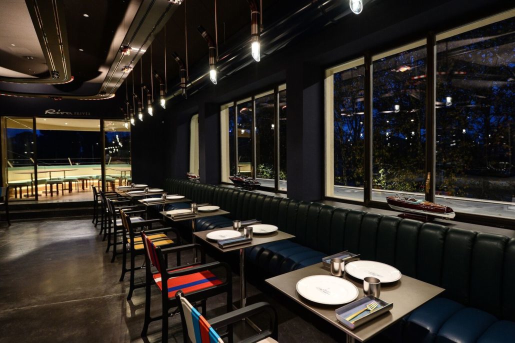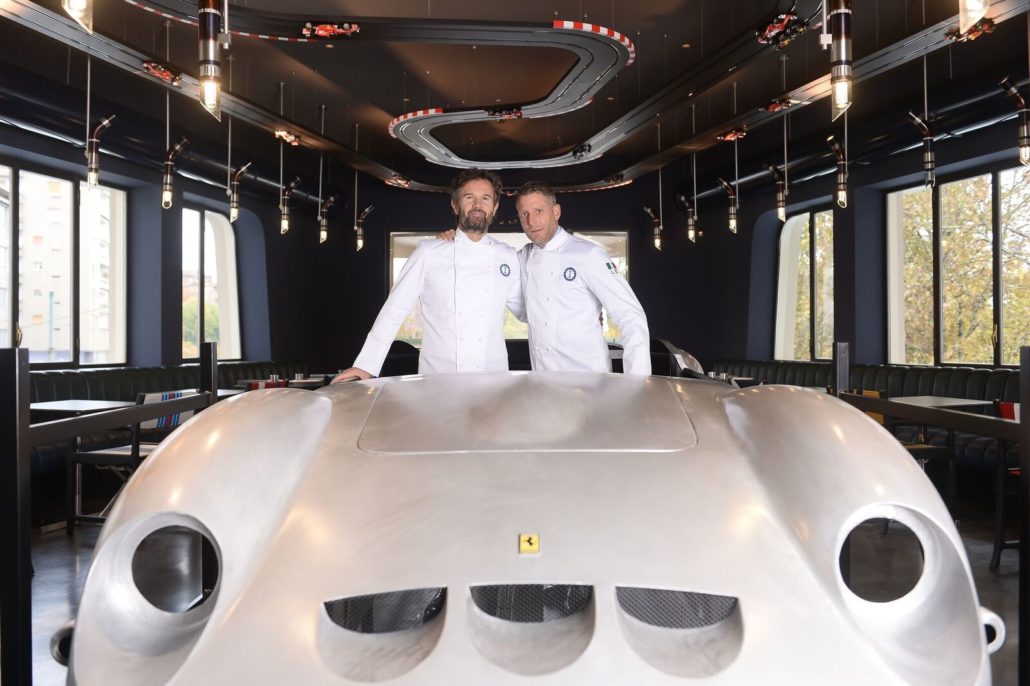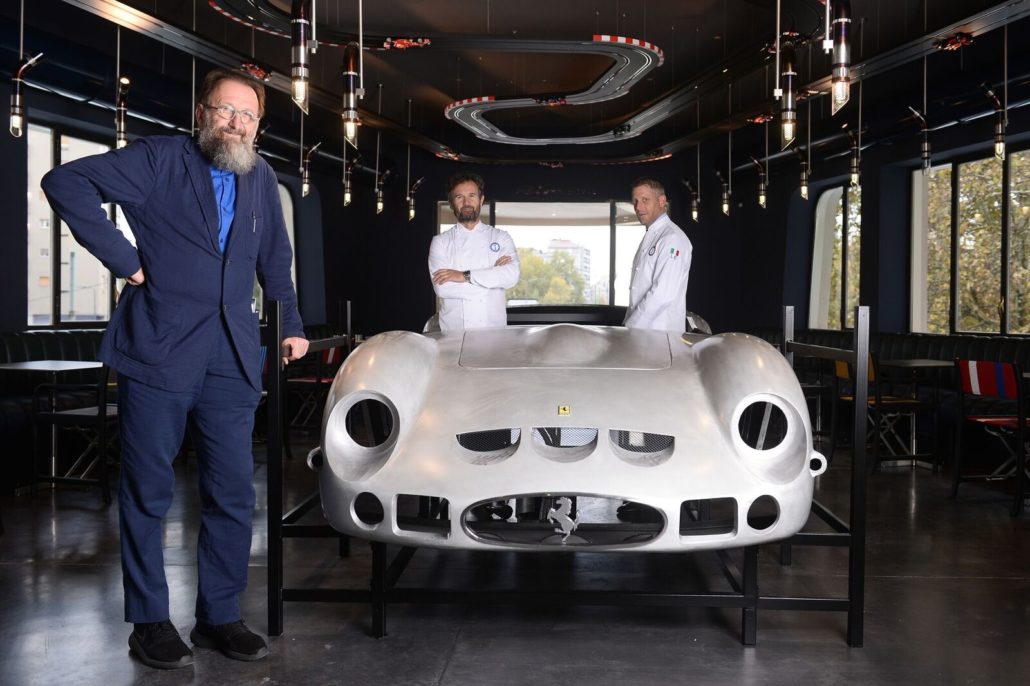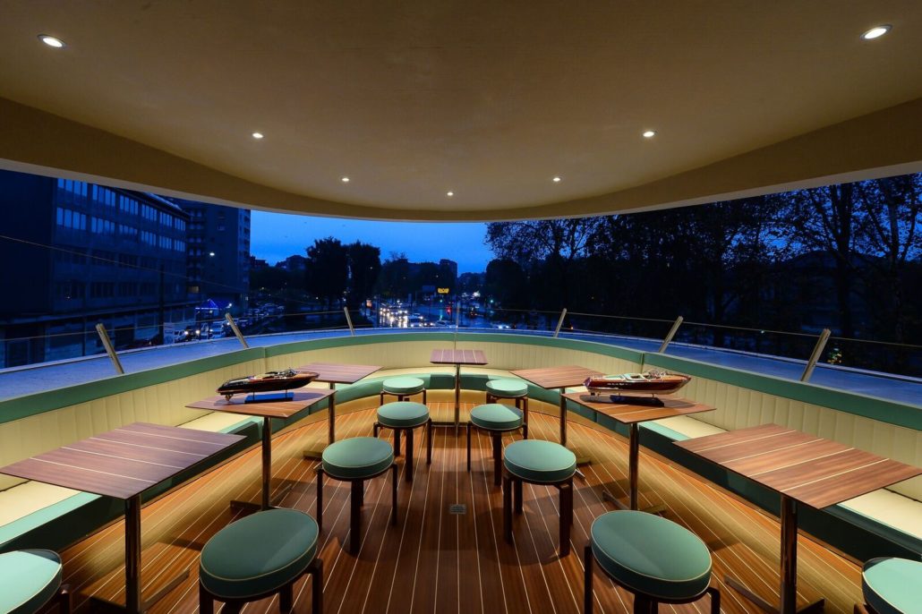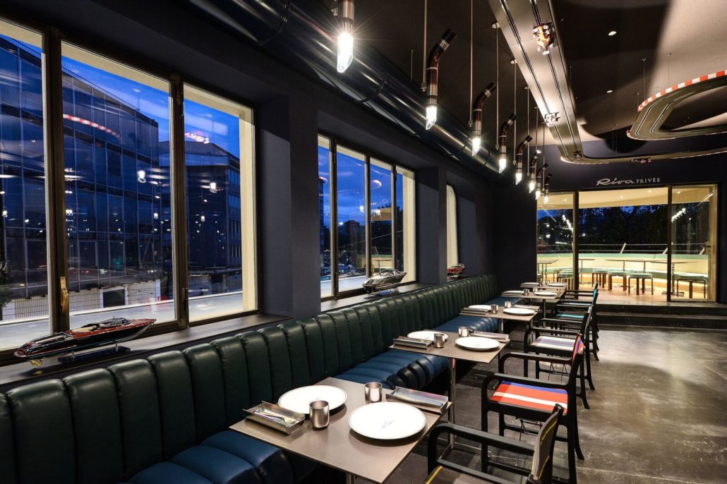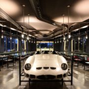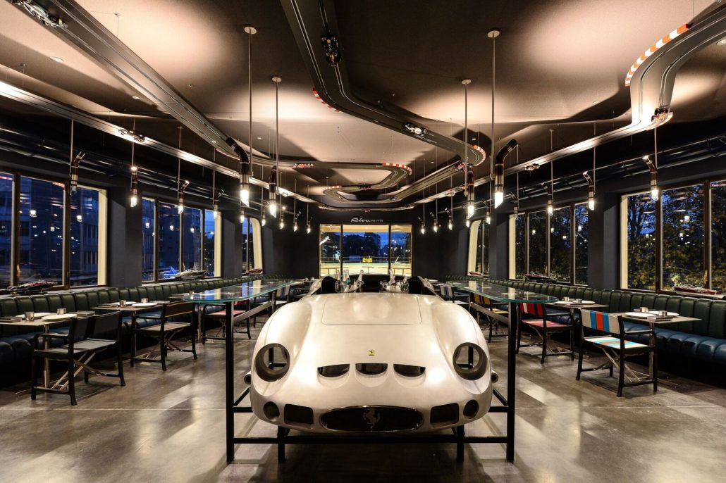Si arriva al ristorante Garage Italia Milano che occupa un’unica grande sala a forma trapezoidale affacciata su piazzale Accursio. Al centro dello spazio si fa notare una Ferrari 250 GTO che è stata trasformata in una funzionale cocktail station per animare le serate. Per l’arredo sono state scelte 50 sedie 298 (design De Lucchi per Cassina) personalizzare con grafiche racing. Le poltrone sono i sedili della Ferrari Daytona e della Ferrari 599, con rivestimento in pelle Frau bicolore.