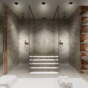 Immaginatevi uno spazio wellness in cui la luce scivola sulla pietra naturale, facendone risplendere le superfici con inattesi chiaroscuri. E’ una piacevole sorpresa il nuovo spazio bagno di Antolini, capace di creare delicati giochi di banco, grigio, marrone chiaro e beige. La texuture materica di Corteccia conferisce un carattere enigmatico ed ipnotico all’insieme progettato dal designer Alessandro La Spada.