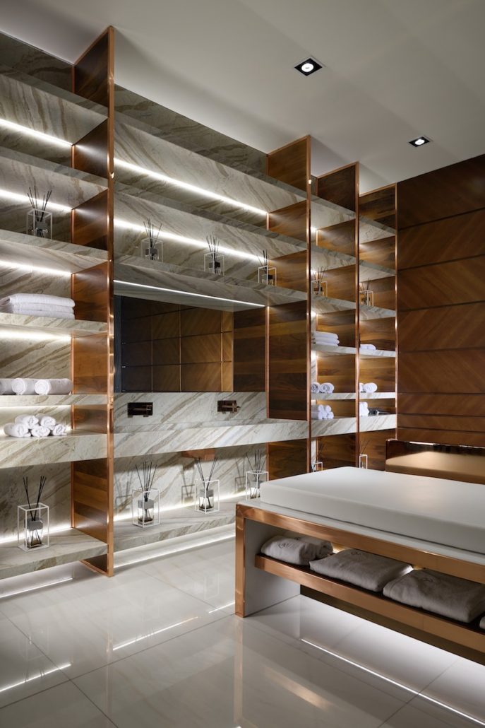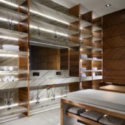 I toni naturali della sfato quartzite Corteccia, materiale che rammenta poeticamente la veste di alberi secolari, trovano una perfetta rispondenza nei profili in metallo che incorniciano i volumi dello spazio storage, in una geometria pulita e leggera. Lo spazio è suddiviso in ripiani e unità che incorporano i lavabi, l’ampio armadio a giorno, invece, crea uno spazio totale in cui ogni singolo oggetto trova elegantemente il proprio posto.