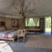 L’anima green degli alloggi sta anche nella pavimentazione in legno che poggia sul prato, rialzata rispetto al suolo per garantire la salubrità dei luoghi, senza intaccare in alcun modo la conformazione dell’area. Le quattro tende possono ospitare fino a 13 persone, hanno una spaziosa stanza da bagno con doccia e sanitari in ceramica e dispongono di un giardino privato per godersi il soggiorno in totale relax e con la giusta privacy.