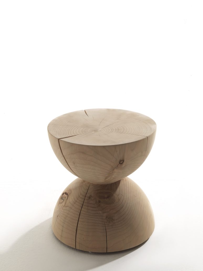 CLESSIDRA Sgabello in legno massello di cedro profumato lavorato da un blocco unico, che si caratterizza per due semisfere poste una sopra l’altra a formare una Clessidra.