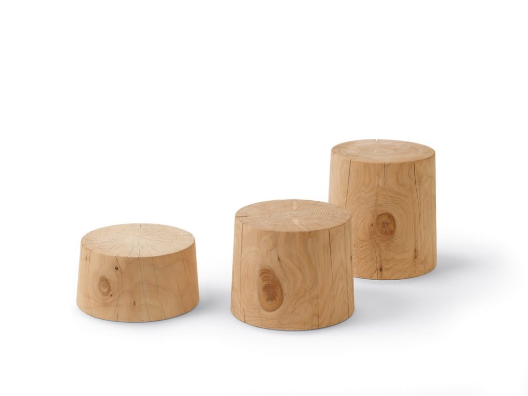 ECO Tavolini in legno massello di cedro profumato, disponibili in due diametri, lavorati da sezioni di tronco blocco unico, che mettono in evidenza i caratteristici anelli concentrici dell’albero.