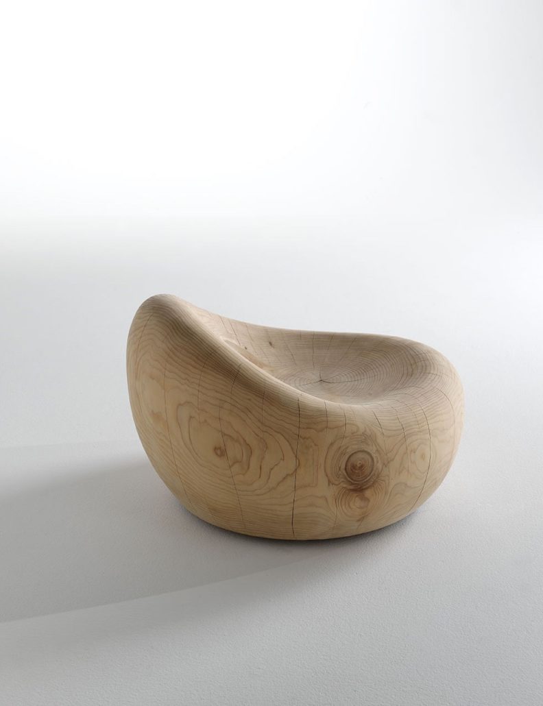 MAUI Poltrona in legno massello di cedro profumato lavorata da un blocco unico. Si tratta di un monolite scultoreo dal design curvilineo e sinuoso caratterizzato da una seduta ergonomica in linea di continuità con lo schienale. Disponibile nella versione con o senza basamento con gamba tubolare e piastra in ferro.