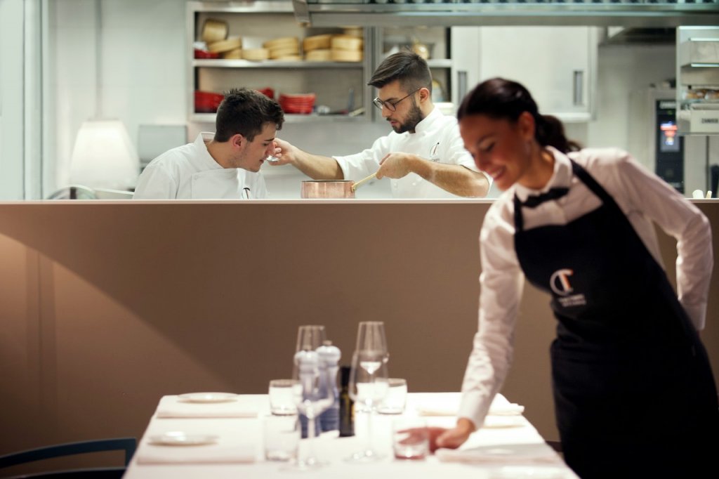 A menù, un percorso degustazione che cambia di stagione in stagione, 5 portate con la possibilità di abbinare altrettanti vini in una complice armonia. Un vero e proprio viaggio nei sapori che si riflette anche nella scelta della progettazione della sala, pensata per lasciare sempre aperto il dialogo tra commensali e personale di cucina.