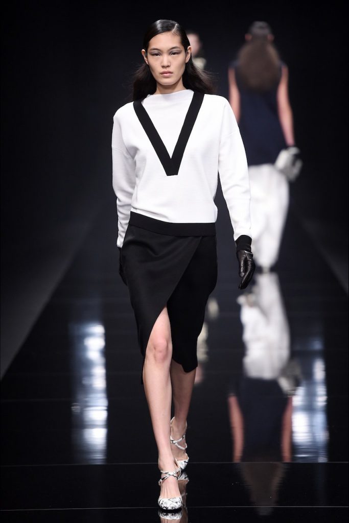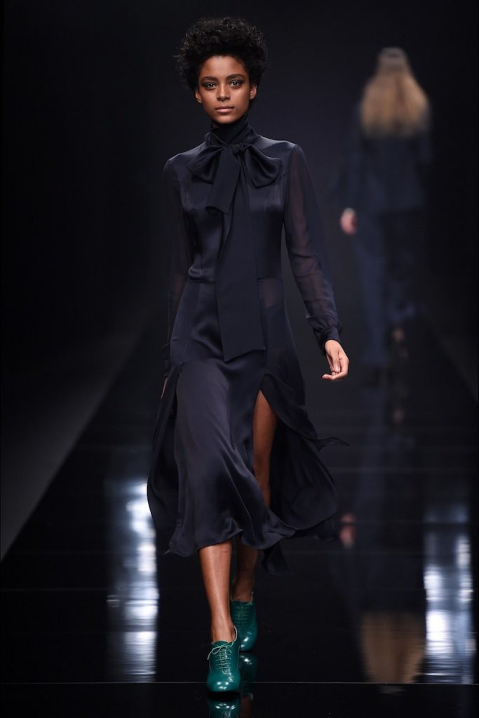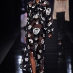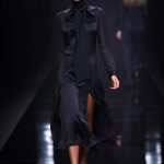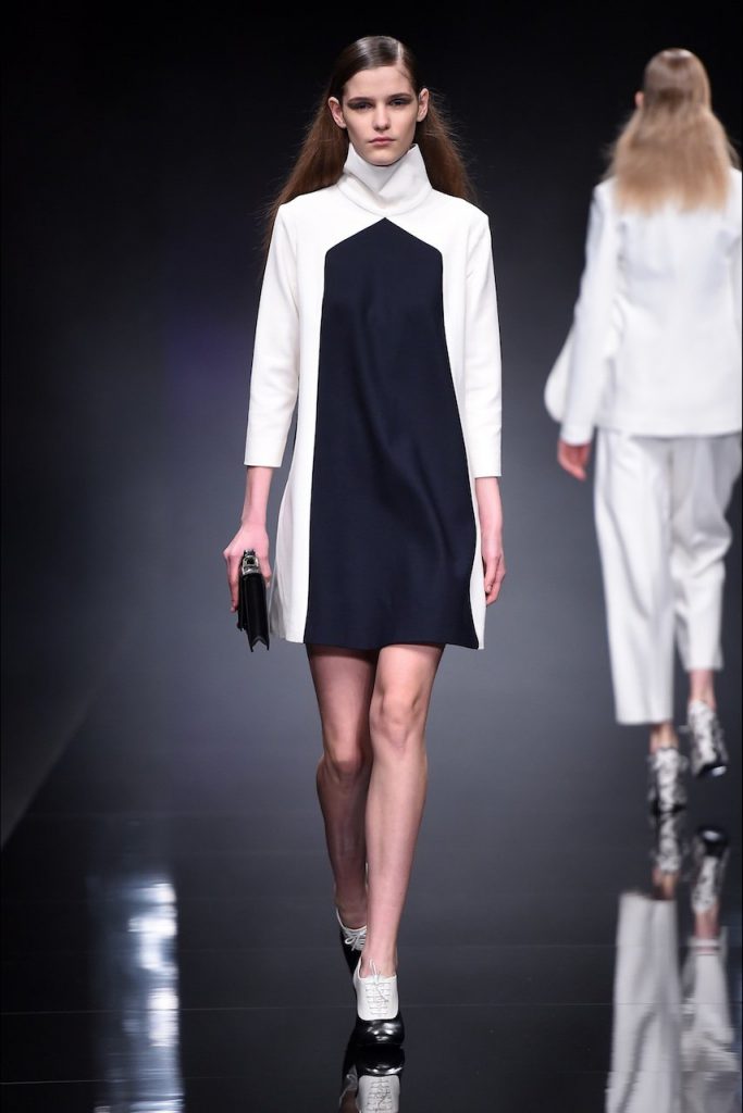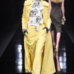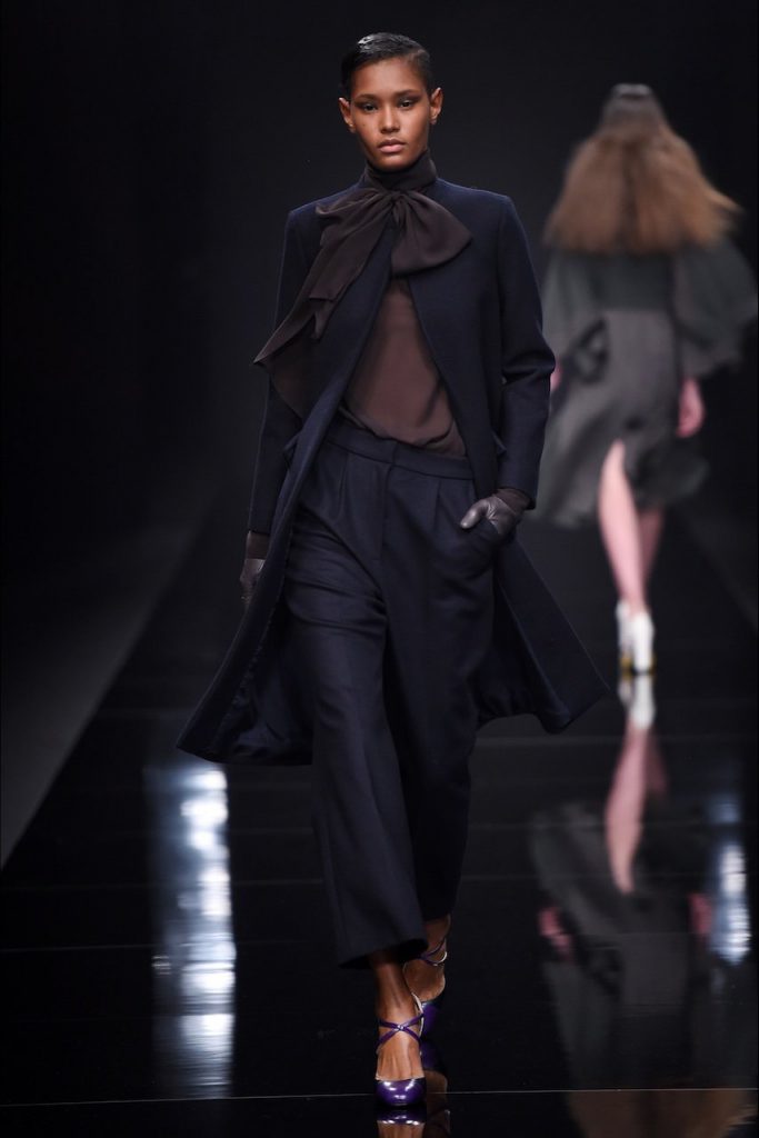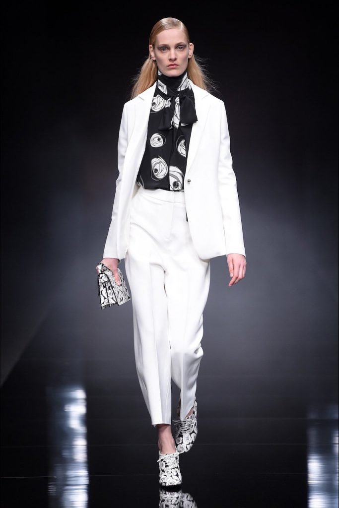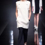 Sono i colori più chic a far tendenza: il bianco, completamente asettico, il nero, non colore per eccellenza, il viola, macchia carismatica, il verde petrolio, vivace ma sobrio. Poco spazio è invece concesso alle decorazioni: l’unico tocco ornamentale è rappresentato da un fiore stilizzato stampato su camicie e abiti al ginocchio. Per il resto la pulizia è totale. Con pantaloni svasati a vita alta e tuniche al ginocchio di stampo grafico. Il ritorno del fiocco viene riproposto in varie versioni più o meno voluminose, ma sempre con estrema classe.
