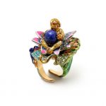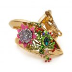 Sta per arrivare nelle vetrine, la prima capsule di gioielli Casadei realizzata con Ilenia Corti. Presentata durante la settimana della moda primavera/estate 2017 a Milano, la collezione unisce la creatività di due eccellenze italiane – Casadei, maison di accessori di fama globale, e Ilenia Corti, giovane e talentuosa creatrice del jewelry brand Vernissage – in una nuova avventura. Il fil rouge che lega i due mondi è una natura brulicante e iper-cromatica, per preziose sculture che sembrano prendere vita come tableaux vivants. Ed ecco rane velenose e scimmie rampicanti giocano su piante tropicali e carnivore, tra orchidee colorate e foglie rigogliose, mentre le calzature si abbinano ai gioielli o diventano loro stessi scintillanti bijoux.