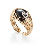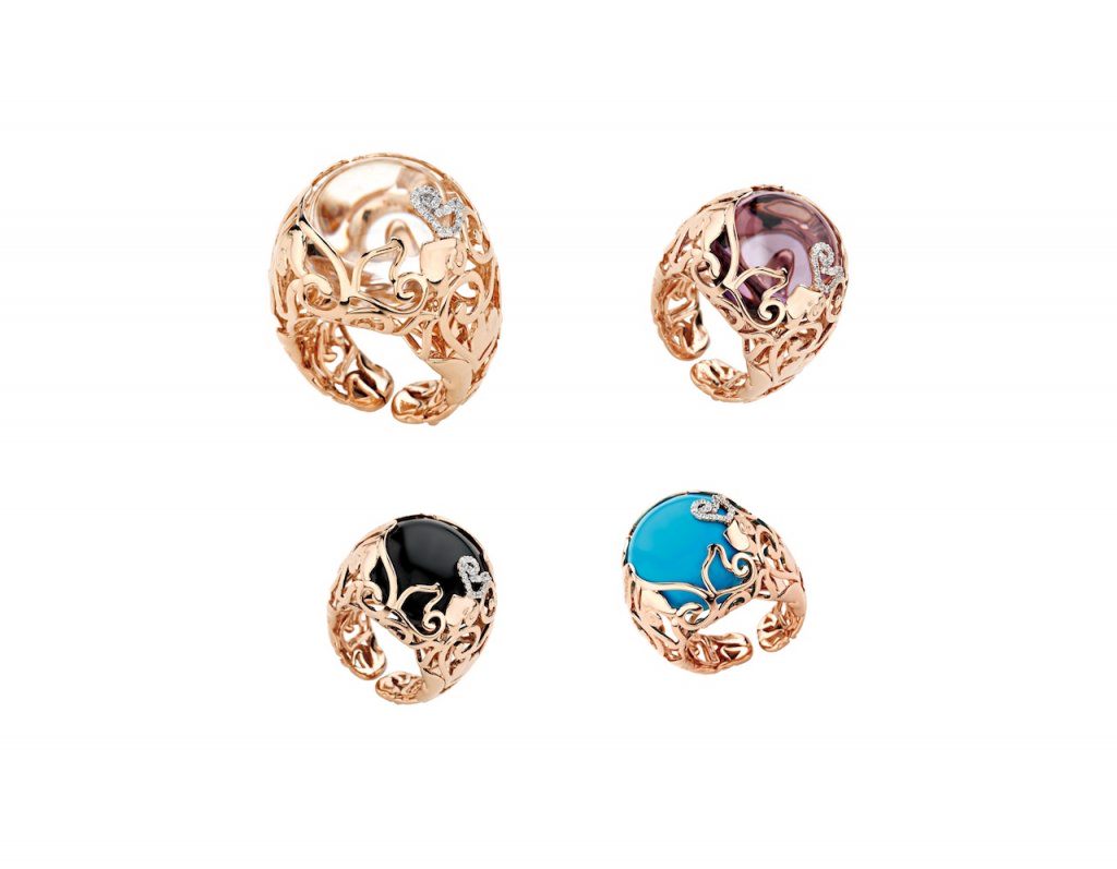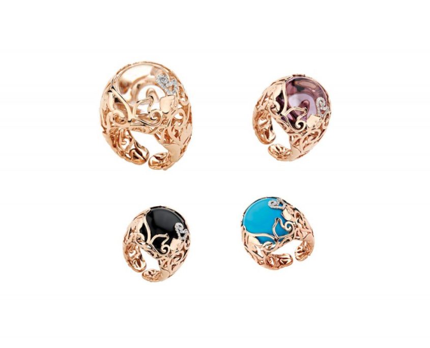 Fra i pezzi di punta della capsule, l’anello Magie che è composto da una preziosa pietra incastonata su una elegantissima trama di galletti-cuori in oro rosa e diamanti bianchi. La montatura avvolge la pietra preziosa come se fosse uno scrigno. L’anello Magie viene proposto nelle varianti con il quarzo rosa, con l’ametista, con il topazio blu sky e con la giada nera. Le forme sono generose e sembrano danzare sinuose al ritmo dell’amore, i volumi sono importanti ma i colori sono i veri protagonisti perché donano personalità. Poi ancora, collane in oro giallo o rosa che possono essere indossate sia da sole sia insieme a ciondoli e maxi orecchini in oro bianco e rosa con diamanti oppure con cristallo di rocca.