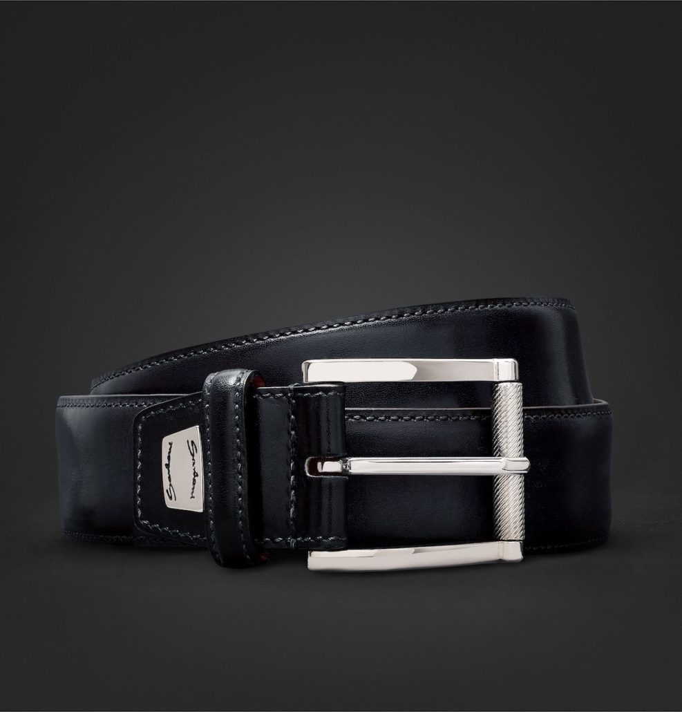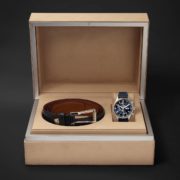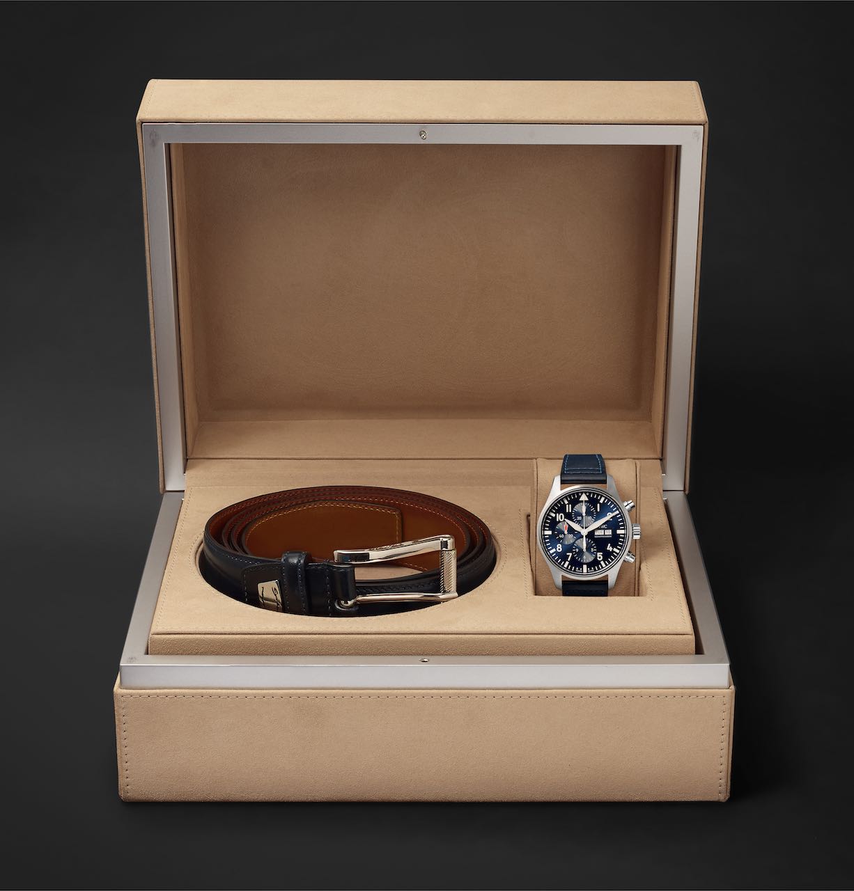 Il set da uomo è composto da un IWC Pilot Chronograph con cinturino dipinto a mano da Santoni e una cintura in pelle abbinata, anch’essa colorata a mano, in una particolare tonalità di blu, sviluppata appositamente per Mr Porter.