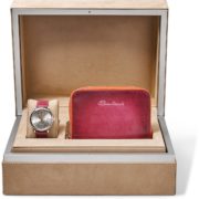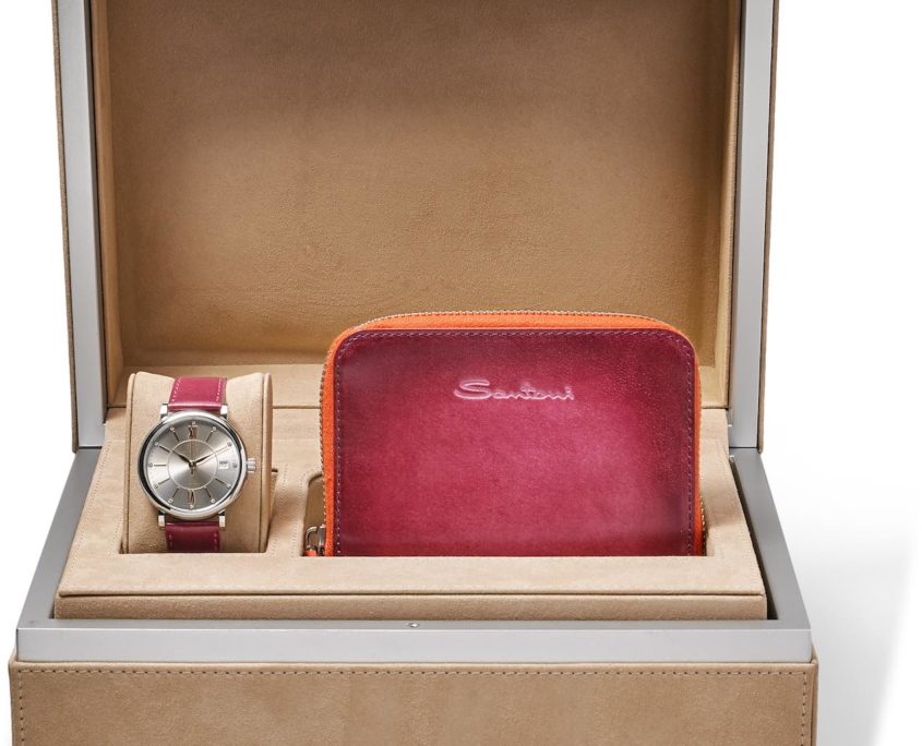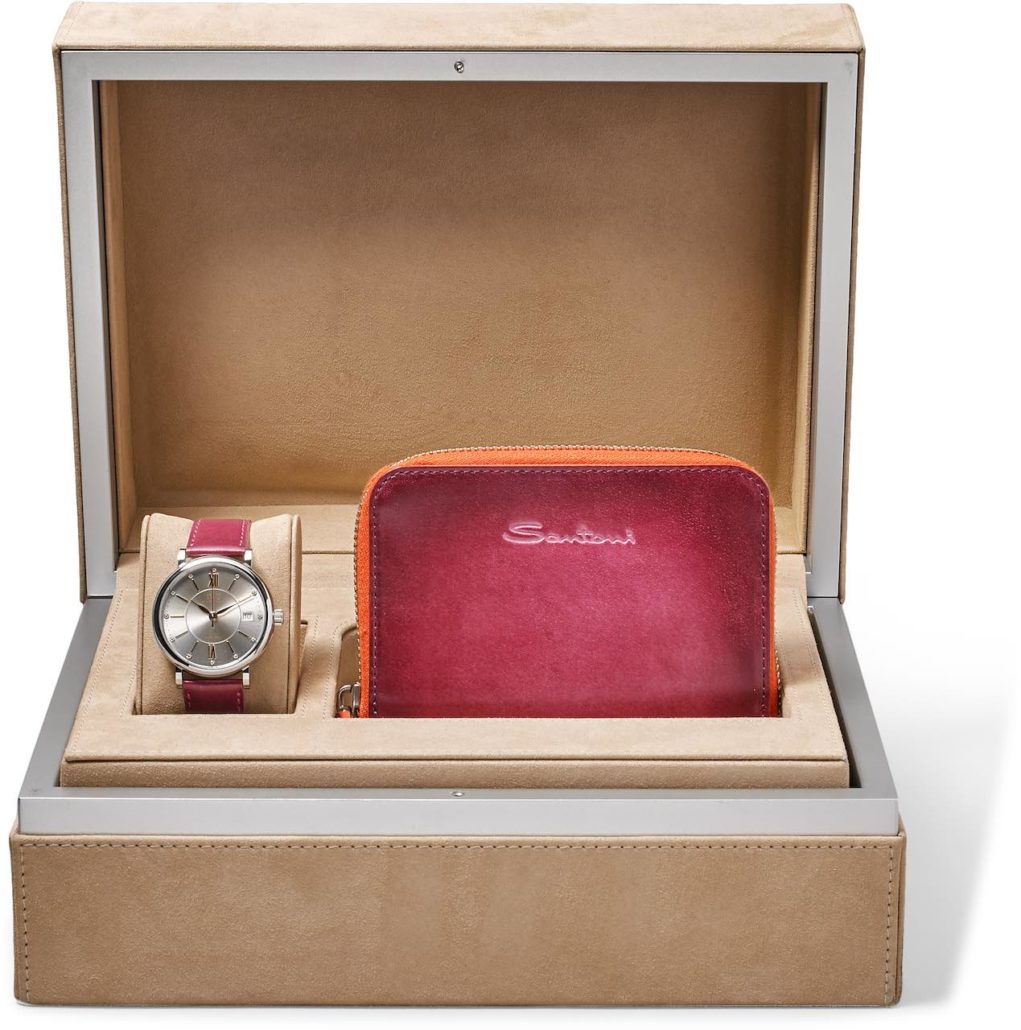 Per lei la scatola è ancora più preziosa: all’interno si svela l’orologio IWC Portofino Automatic 37 con cinturino rosa e un portafoglio con zip coordinato, tutto colorato a mano da Santoni. Un box ad affetto che renderà unico il Natale di chi avrà la fortuna di riceverlo come regalo.