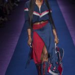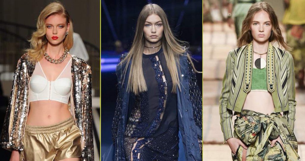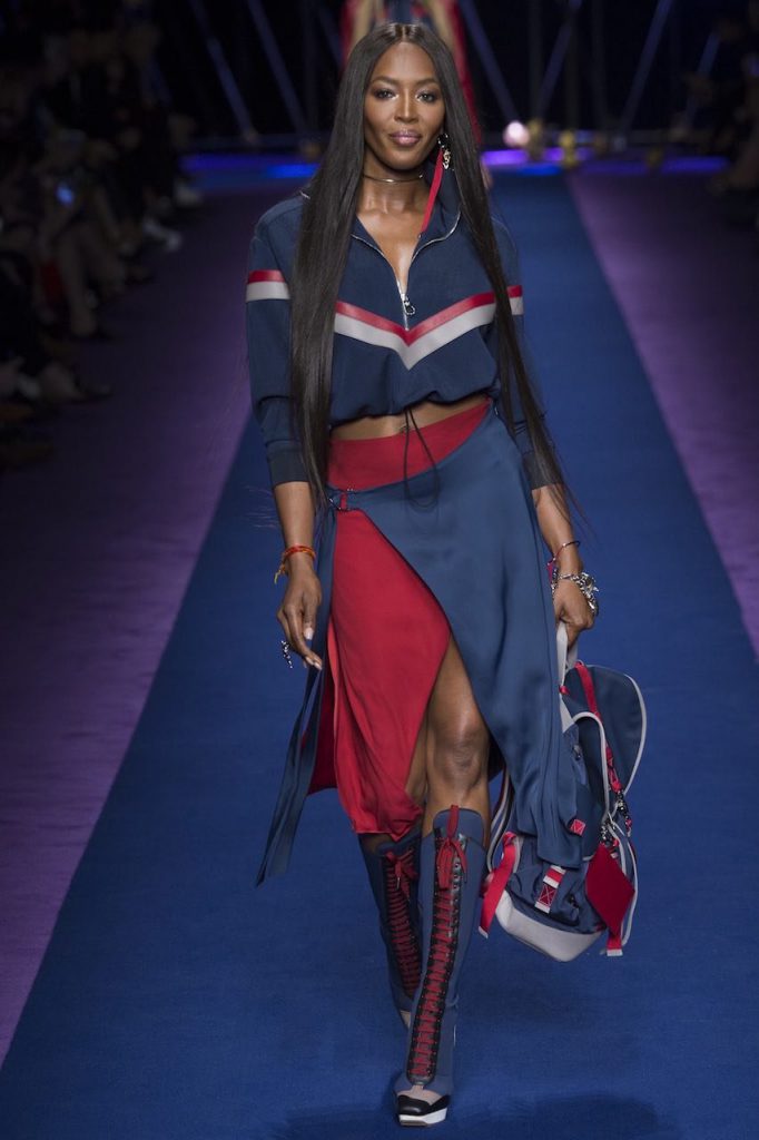 Active glamour alla massima espressione, irrompe alla sfilata di Versace, che più che una passerella è uno “starlight carpet” di supermodelle, dove incedono tra le altre, Adriana Lima o Caroline Trentini. Carmen Kass, Mariacarla Boscono, persino Naomi Campbell per chiudere con l’acclamata Gigi Hadid. Tutta la collezione è un inno allo sportswear de luce: giubbini di pelle futuribili, spolverini paracadute, tute da atlete eroiche compongono un repertorio ad alto impatto. Così Donatella Versace porta in passerella sirene sportive, inguainate in audaci coulisse, color block ipergrafici e maglie metalliche ultraleggere.