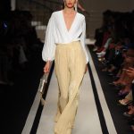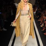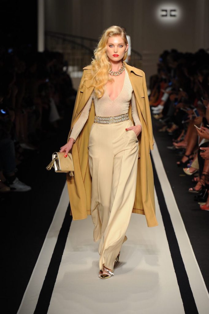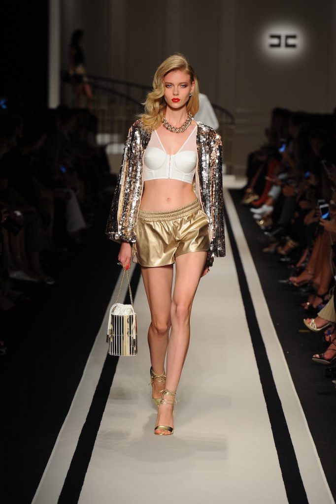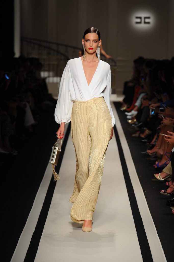 Tra Dynasty e Dallas, la nuova collezione di Elisabetta Franchi che rievoca l’atmosfera dorata dell’America anni ottanta, Opulenza e abiti sfarzosi in pieno mood ‘Dress to impress celebrano la sexyness con spacchi, scollature, asimmetrie e trasparenze per un seducente effetto nudo. Anche i pantaloni con fondi esagerati, a zampa e a palazzo, svelano le gambe attraverso spacchi iper femminili. A completare gli accessori, indispensabilielementi di scena, come tacchi vertiginosi e cinture corazza con catene oro e maxi strass.