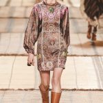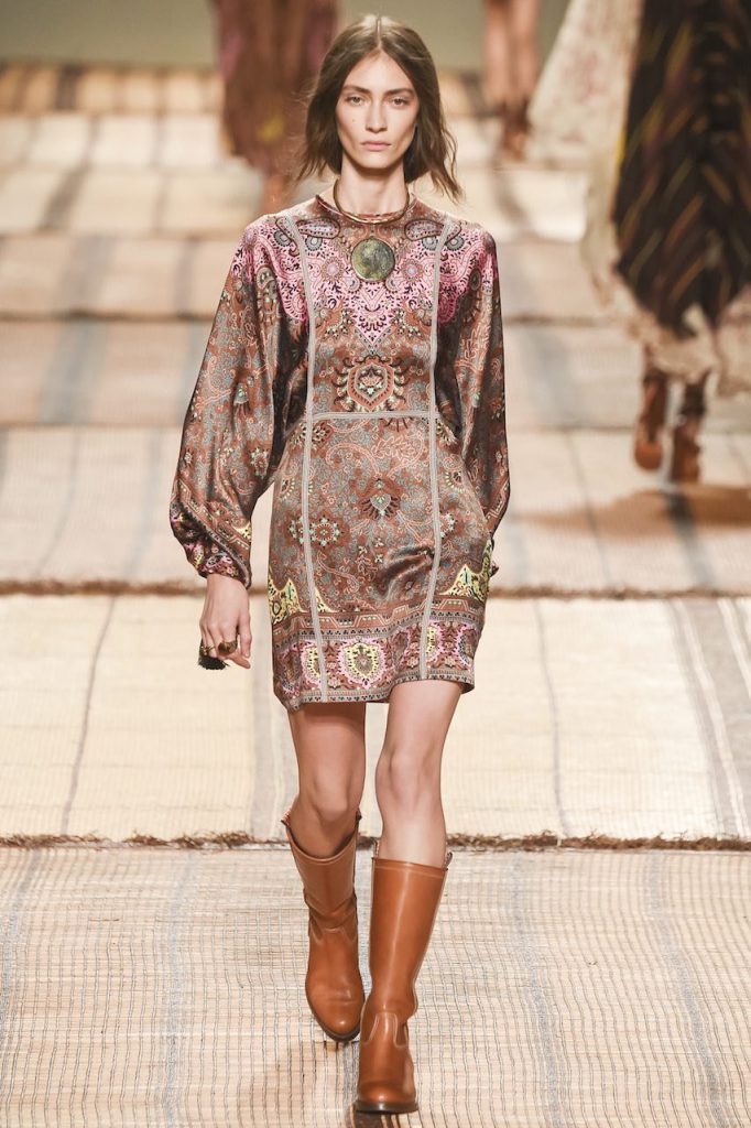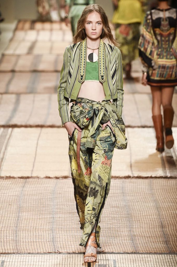 Nomadi contemporanee alla ricerca di un’avventura: così Veronica Etro immagina le donne per la prossima estate 2017. Sono muse che sembrano emergere dalla dune del deserto, indossando preziosi abiti ricamati, vesti di seta, iconiche stampe paisley e motivi etnici declinati in toni sgargianti. Key piece della prossima estate di Etro, il caftano è rinnovato nelle forme, lunghe o corte, e viene sfoggiato anche sotto spolverini cerati o giacche di broccato o poncho hippie.