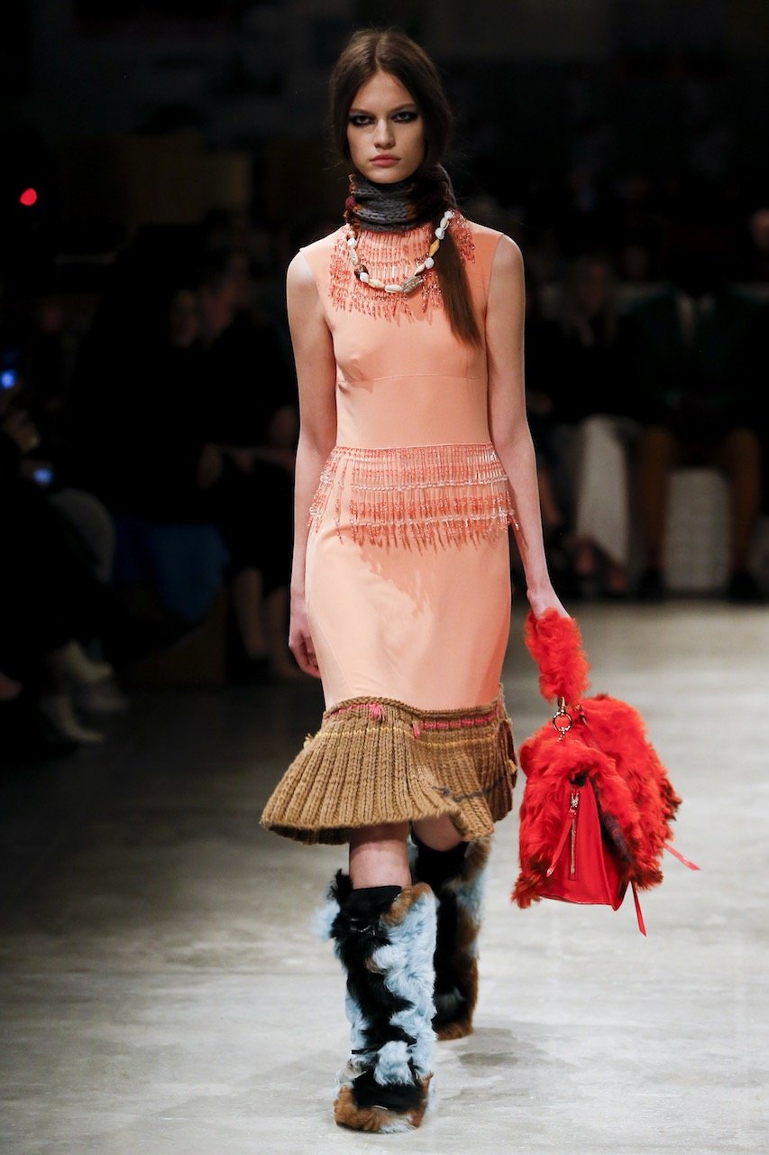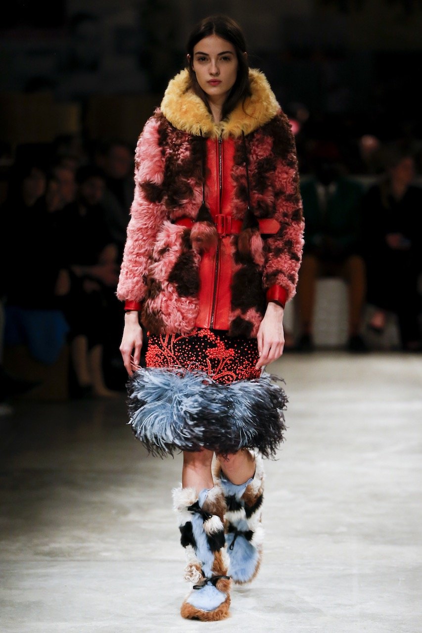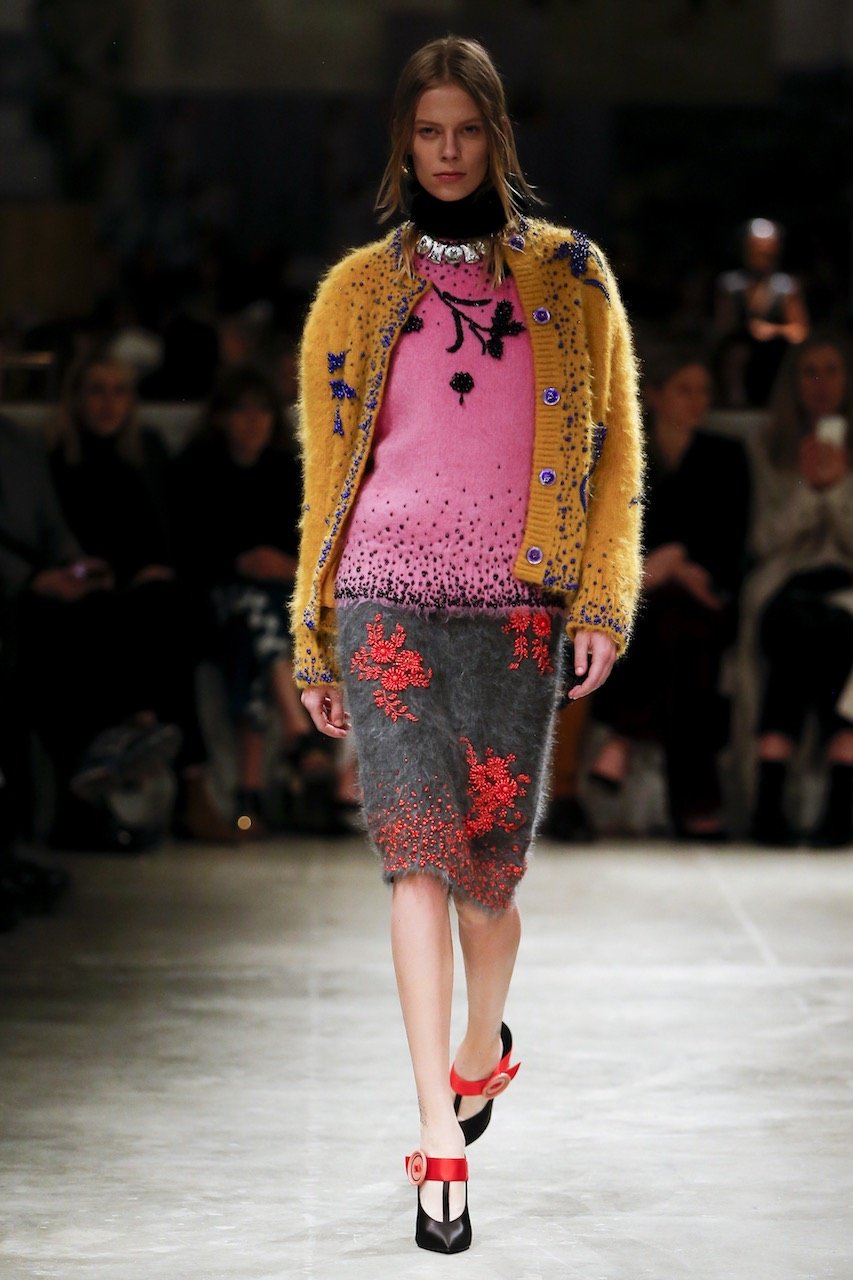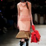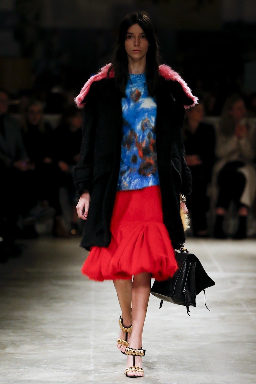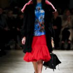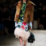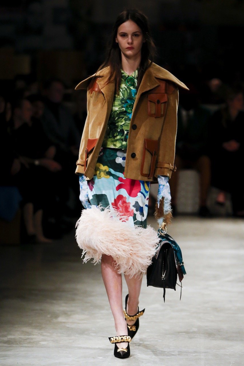 “Fashion is about the everyday and the everyday is the political stage of our freedoms“, campeggia scritto su uno dei poster che decorano la location. E i modelli rileggono suggestioni storiche e di costume, andando a definire un inventario della femminilità: ci sono le flappeur degli anni Venti con abiti aderenti fluttuanti di piume e frange, le hippies dai reggiseni decorati con conchiglie, e le pin up con femmes fatales disegnate sui vestiti. E tra reggiseni che richiamano proteste storiche e illustrazioni Fifties, c’è tutto il repertorio pradiano: piume, paillettes, reggiseni come top, pantaloni oversize stretti in vita da cinture colorate. Mentre gli accostamenti mescolano il rigorose dei tessuti e dei tagli con la frivolezza irresistibile delle stampe.