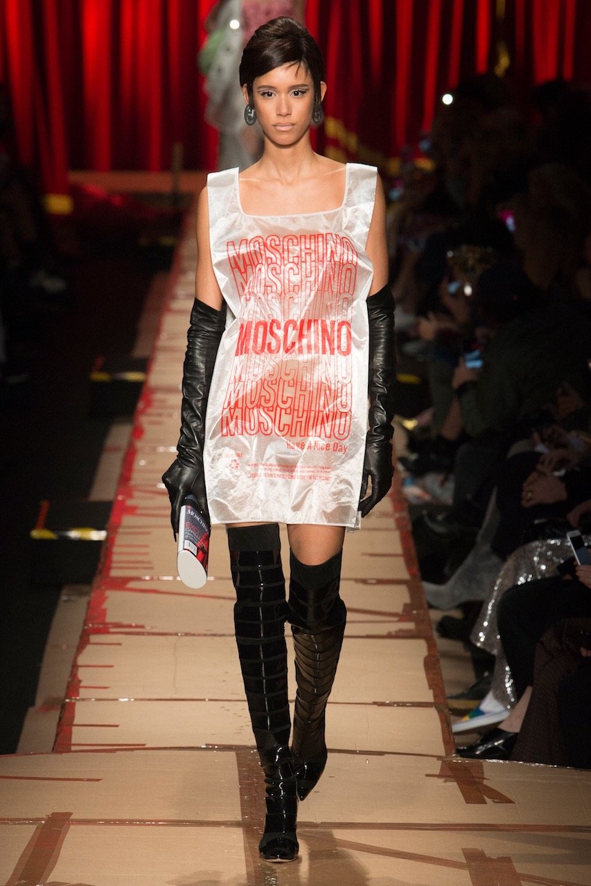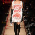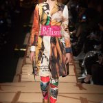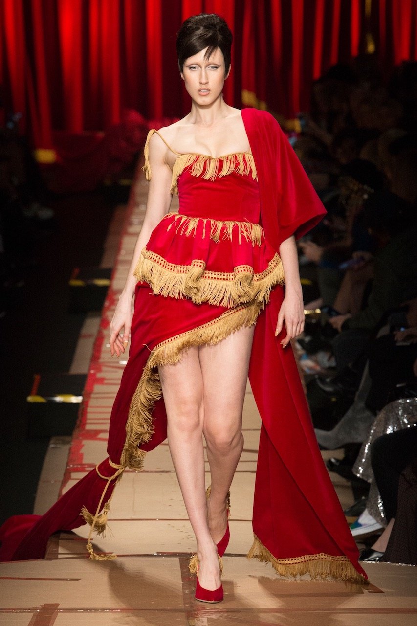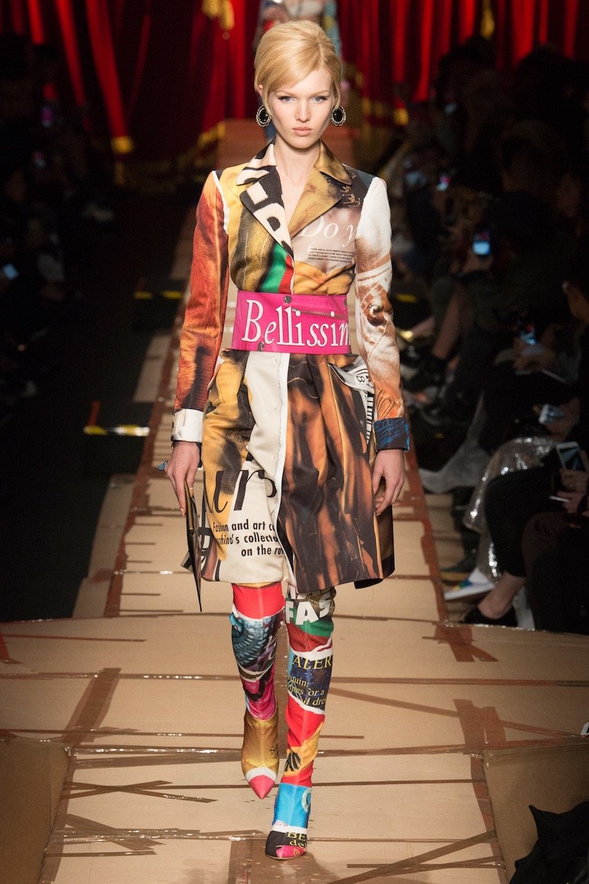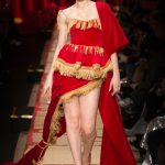 Incendiare, come sempre la collezione, disegnata da Jeremy Scott per Moschino. Per questa stagione è di scena una sorprendente recycled couture, con abiti effetto cartone, decori garbage e stampe con puzzle di editoriali. L’effetto è ad alto impatto per uno show che si è confermato pop e iperbolico. Il défilé si apre così con la Cardboard couture, ovvero la couture di cartone. In maniera davvero sapiente, il designer americano ha realizzato mini abiti, cappotti e tailleur simil-Chanel di panno stagnolato. Ma è la sera a rappresentare il vero trionfo della sua recycled couture. Ecco scenosi longdress e abiti rossi fiammanti che ricordano i sipari da teatro, come quello indossato dalla modella Anna Cleveland sulle note dell’aria di Giuseppe Verdi “La donna è mobile” . E come ultimo tocco, spiccano i cappelli chandelier e gli scultorei copricapo realizzati dall’artista Stephen Jones.