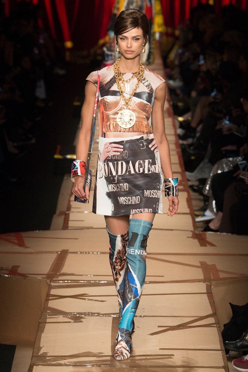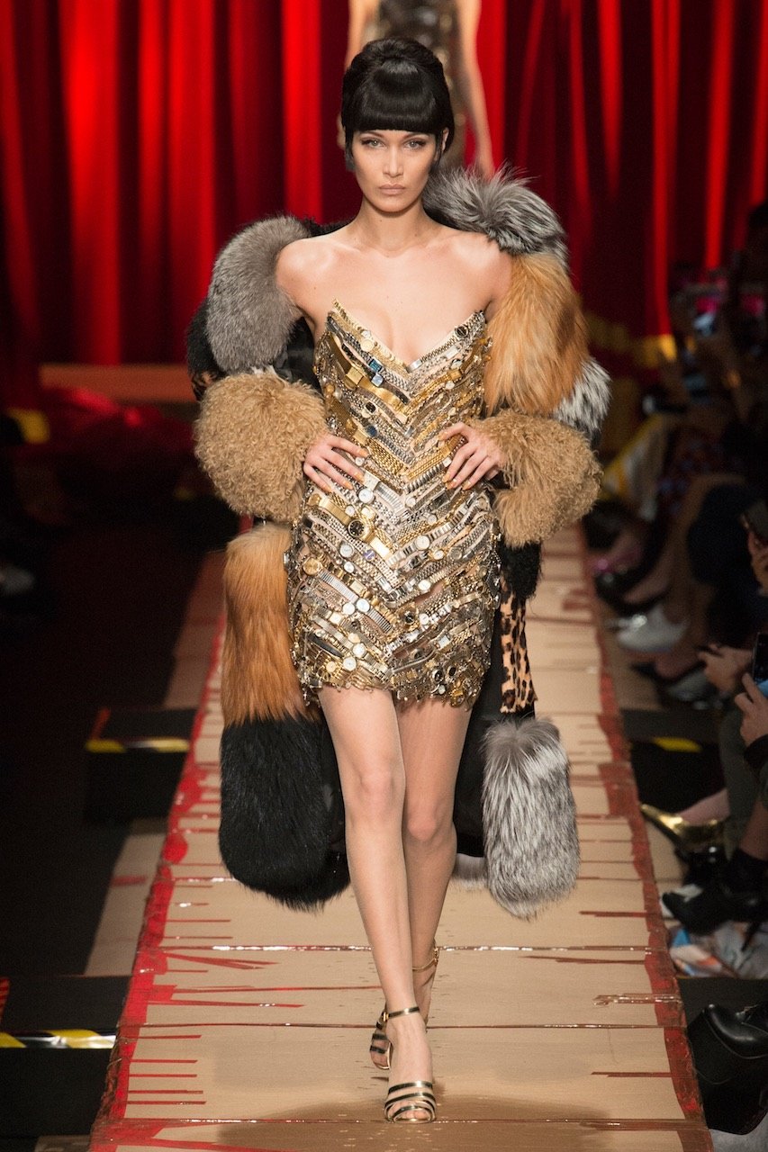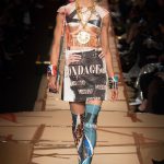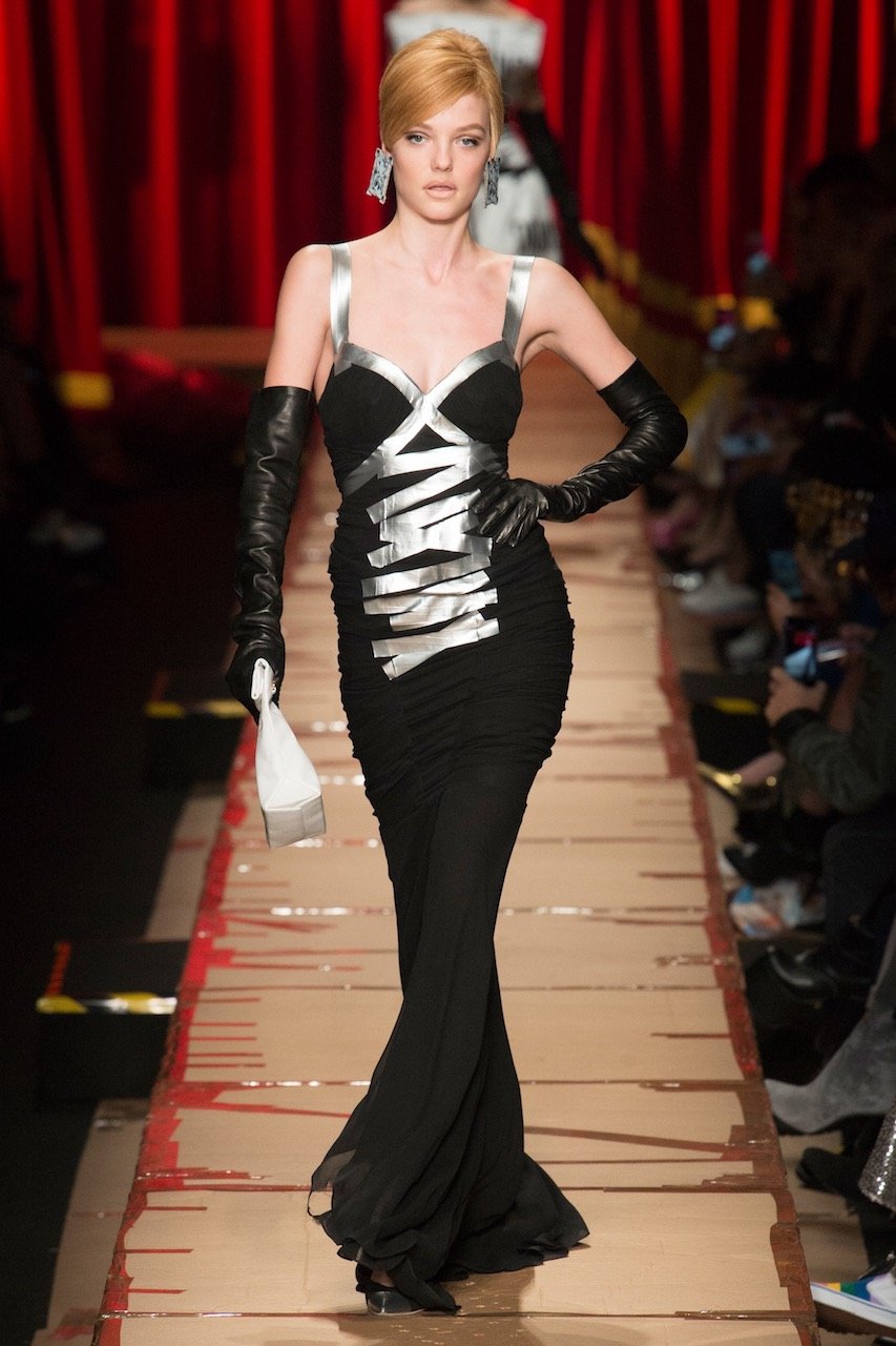 Incendiare, come sempre la collezione, disegnata da Jeremy Scott per Moschino. Per questa stagione è di scena una sorprendente recycled couture, con abiti effetto cartone, decori garbage e stampe con puzzle di editoriali. L’effetto è ad alto impatto per uno show che si è confermato pop e iperbolico. Il défilé si apre così con la Cardboard couture, ovvero la couture di cartone. In maniera davvero sapiente, il designer americano ha realizzato mini abiti, cappotti e tailleur simil-Chanel di panno stagnolato. Ma è la sera a rappresentare il vero trionfo della sua recycled couture. Ecco scenosi longdress e abiti rossi fiammanti che ricordano i sipari da teatro, come quello indossato dalla modella Anna Cleveland sulle note dell’aria di Giuseppe Verdi “La donna è mobile” . E come ultimo tocco, spiccano i cappelli chandelier e gli scultorei copricapo realizzati dall’artista Stephen Jones.